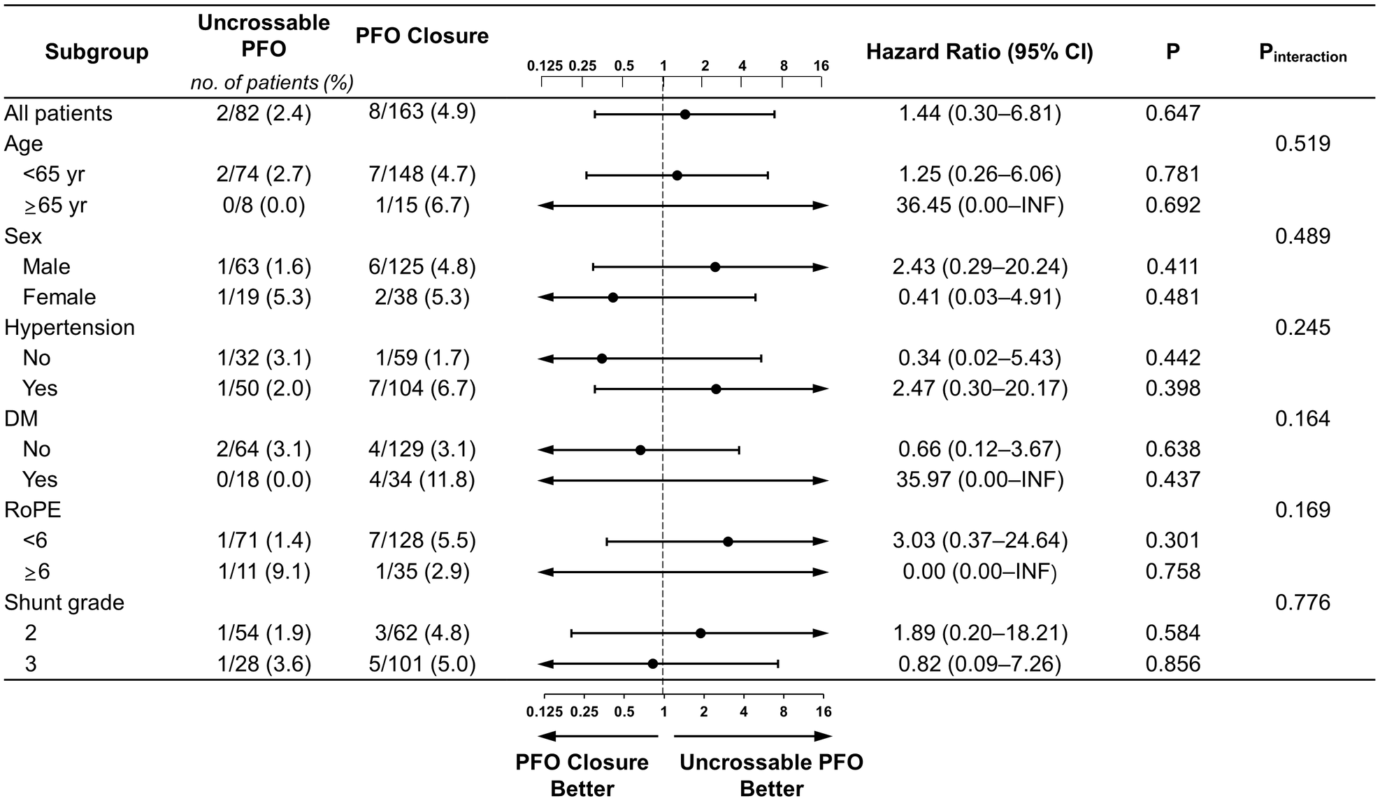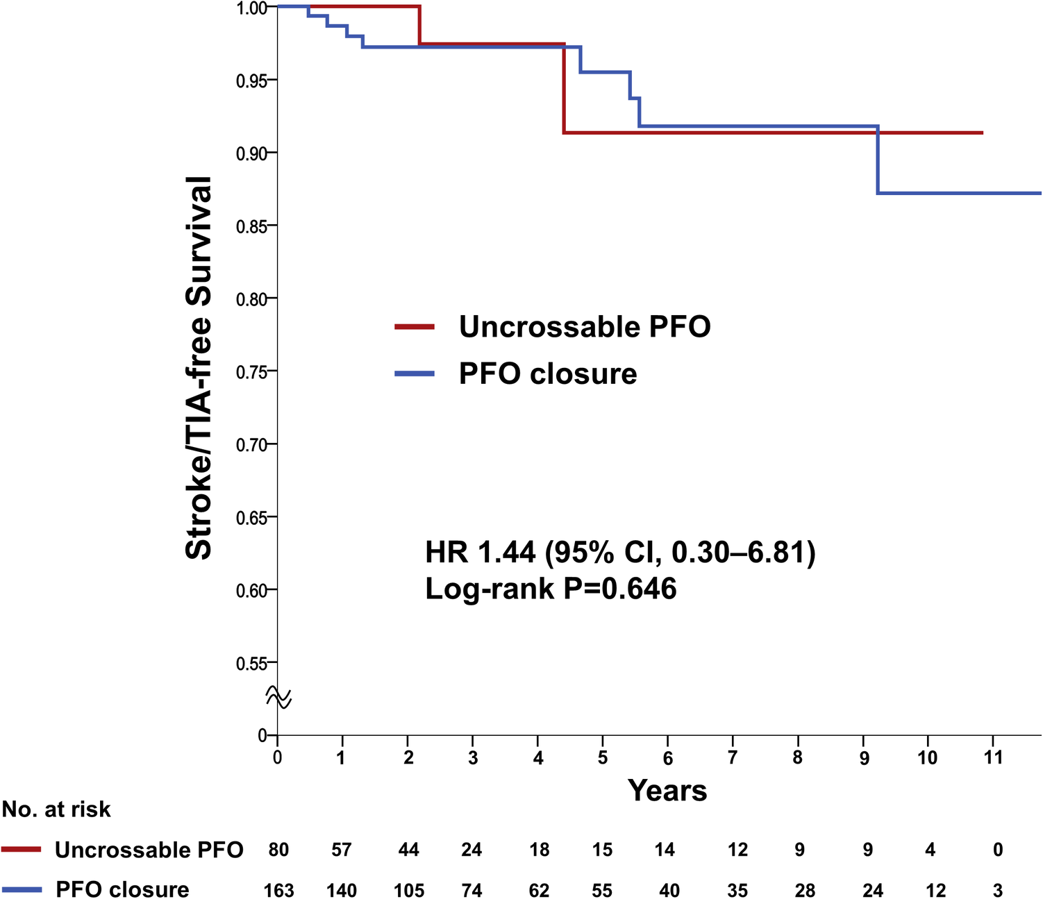 Of 286 patients, 245 were included in the analysis after excluding those with transseptal puncture technique usage or concurrent atrial septal defect. Among them, 82 had uncrossable PFO, and 163 underwent successful PFO closure. Large shunts were more prevalent in the PFO closure group compared to the uncrossable PFO group (62.0% vs. 34.1%, P < 0.001), and resting shunts were also more common in the PFO closure group (17.8% vs. 2.4%, P < 0.001). Stroke or TIA occurred in 2 patients (2.4%) in the uncrossable PFO group and 8 patients (4.9%) in the PFO closure group (hazard ratio, 1.44; 95% confidence interval, 0.30–6.81; P = 0.647). Additionally, no disparities in the occurrence of stroke or TIA were found in subgroups divided by baseline characteristics, RoPE score, or shunt grade.