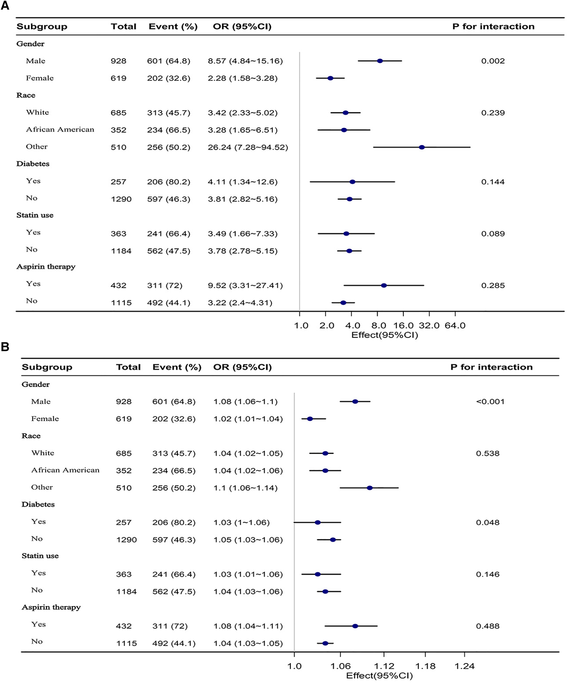 (A) Is a forest plot of the subgroup analysis of VAI and elevated 10-year ASCVD risk. (B) Is a forest plot of the subgroup analysis of LAP and elevated 10-year ASCVD risk. Each subgroup was adjusted for all other variables except the grouping factor itself.