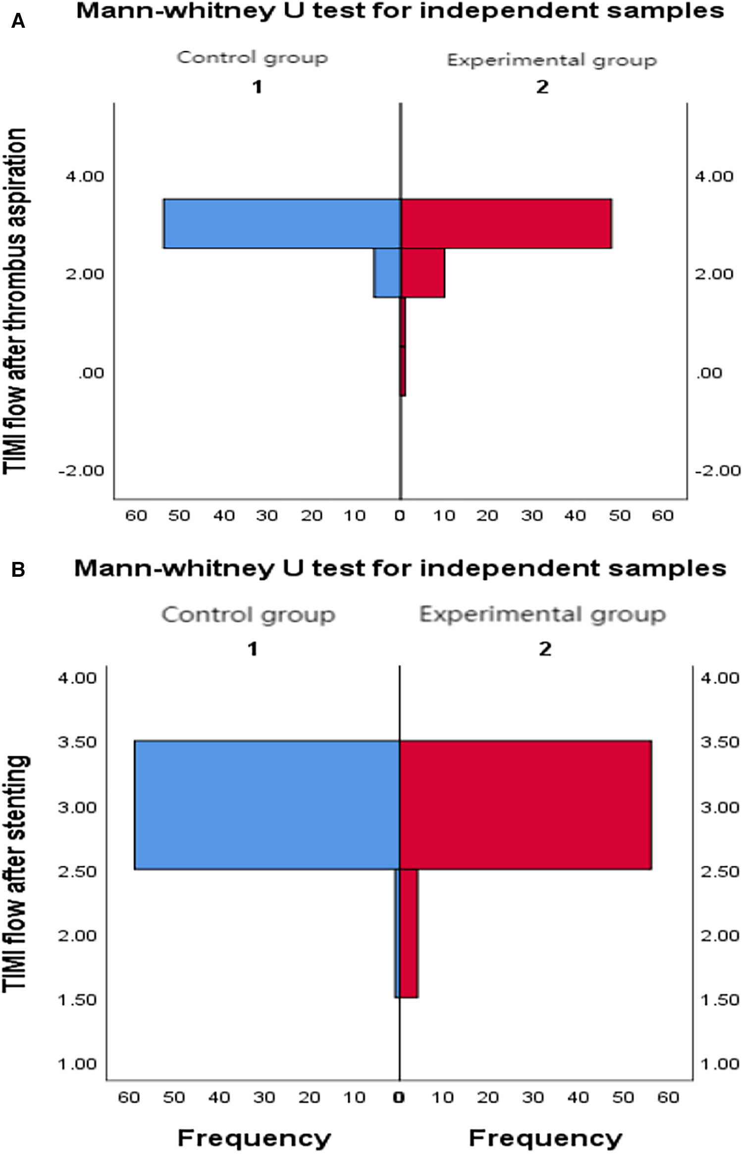 (A) Comparison of TIMI flow grade between two groups after thrombus aspiration. (B) Comparison of TIMI flow grade between two groups after stenting.