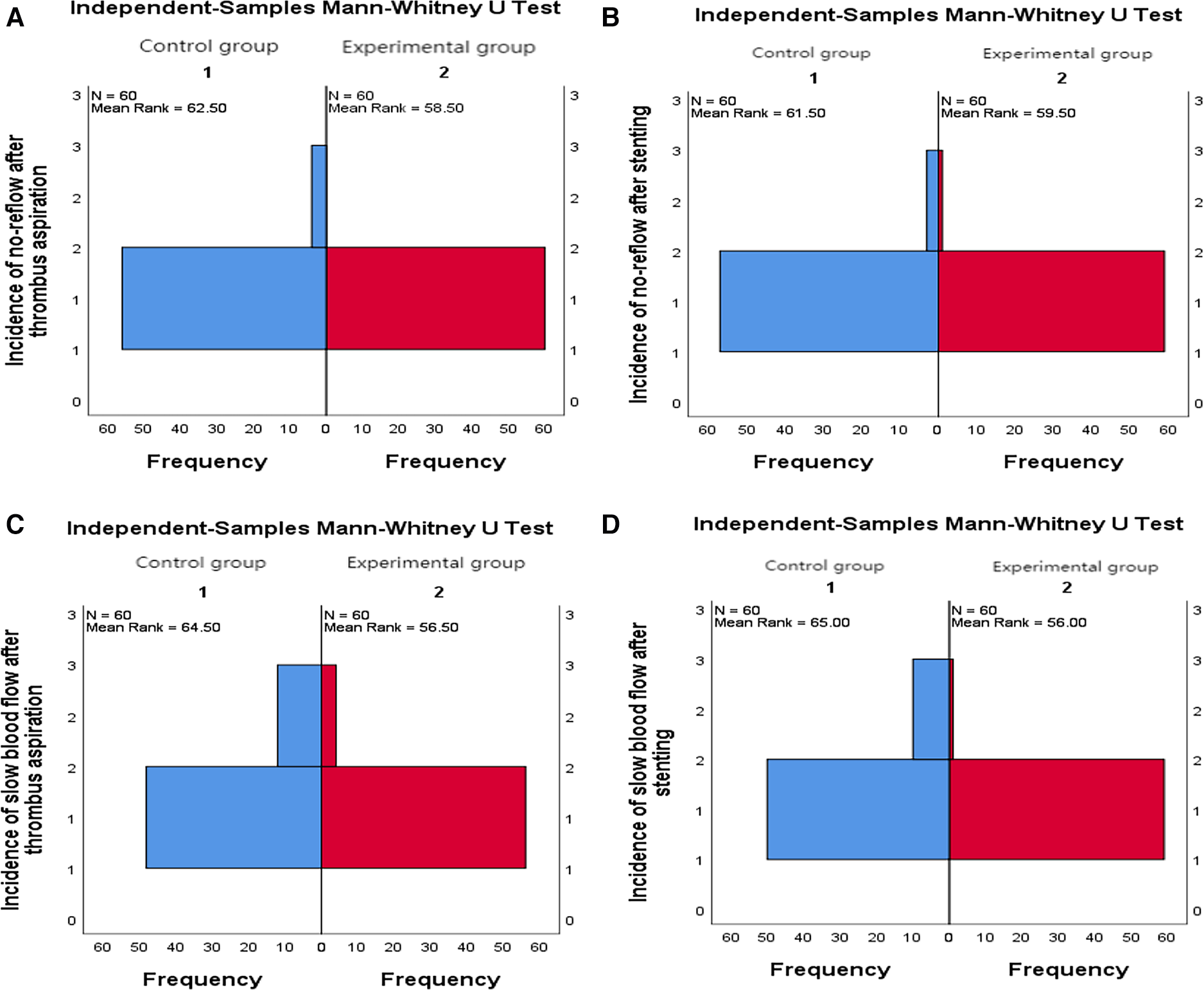 (A) Comparison of the incidence of no-reflow after thrombus aspiration between the two groups. (B) Comparison of the incidence of no-reflo after stenting between the two groups. (C) Comparison of the incidence of slow flow after thrombus aspiration between the two groups. (D) Comparison of the incidence of slow blood flow after stenting between the two groups.