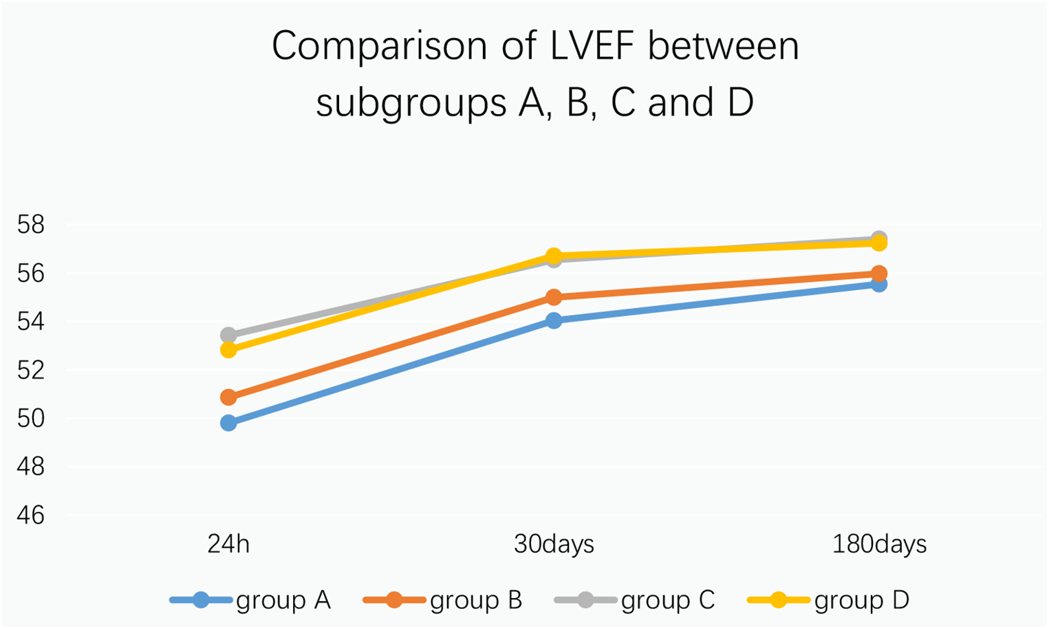 Comparison of LVEF between subgroups A, B, C and D at 24 h, 30 days and 180 days after stenting:Comparison of LVEF among subgroups A, B, C and D: LVEF in group A was lower than that in group C at 24 h after stenting(P = 0.03) (Table 19 and Figure 8).
