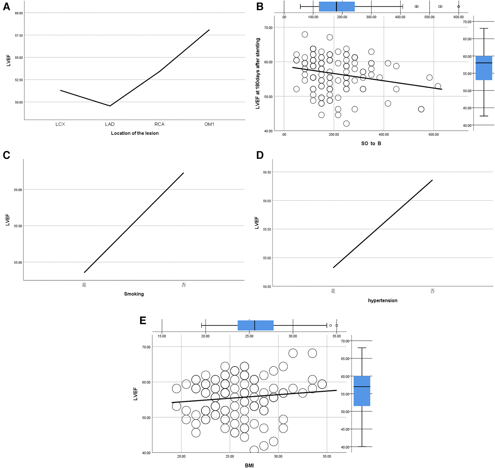 Stepwise regression analysis of LVEF at 24 h, 30 days and 180 days after stenting, as shown in Table 20, LVEF at 24 h after stenting was highly correlated with the location of the lesion; LVEF at 30 days after stenting was highly correlated with lesion location, hypertension and smoking; LVEF at 180 days after stenting was highly correlated with SO2B, hypertension, smoking and BMI (Table 20 and Figures 9A–E).