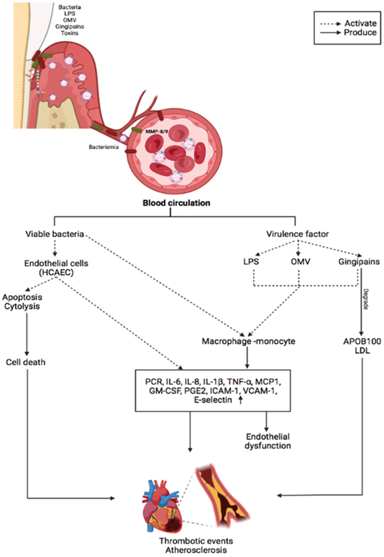 OMVs also play a role in P. gingivalis-related systemic diseases. OMVs have been shown to activate Rho kinase in endothelial cells of umbilical veins via ERK1/2-and p38 mitogen-activated protein kinase, which may promote endothelial dysfunction and CVD (76). Preclinic experiments confirmed that P. gingivalis OMVs significantly increase vascular permeability. P. gingivalis can generate edema by altering the endothelial cell junctions such as platelet endothelial cell adhesion molecule-1 (77). The protease activity of P. gingivalis OMVs can cleave host proteins avoiding the immune response by degrading proinflammatory cytokines and disruption of the extracellular matrix, altering the tissue integrity, suggesting that these vesicles may play a vital role in the vascular damage (78). OMVs also promote vascular smooth muscle cell calcification via ERK1/2-RUNX2, inducing atherosclerosis (78, 79). In vitro, studies have demonstrated that OMVs from P. gingivalis can accelerate the foam cell formation in the murine macrophage and can induce the rupture of atherosclerotic plaque. P. gingivalis 381 also degrades fibrous caps and induce the matrix metalloproteinase (MMP)-9 activity in macrophages, which is involved in plaque disruption (80). In vitro, OMVs from P. gingivalis also induce platelet aggregation, which is essential in atherosclerotic plaque formation. In patients with periodontal disease, an increase in systemic inflammation, with elevated IL-1α and MMP-9 in plasma, causes a slight but significant decrease in cardiac function, dependent on MMP-9 (81). The proteolytic and oxidative activity of P. gingivalis also increased protein oxidation forming two apoB-100 N-terminal fragments that modified the LDL, which induce cell proliferation and could influence atherosclerosis (82). Likewise, the degradation of apoB-100 by Rgps gingipain plays a crucial role in promoting atherosclerosis by P. gingivalis infection (83) (Figure 1).