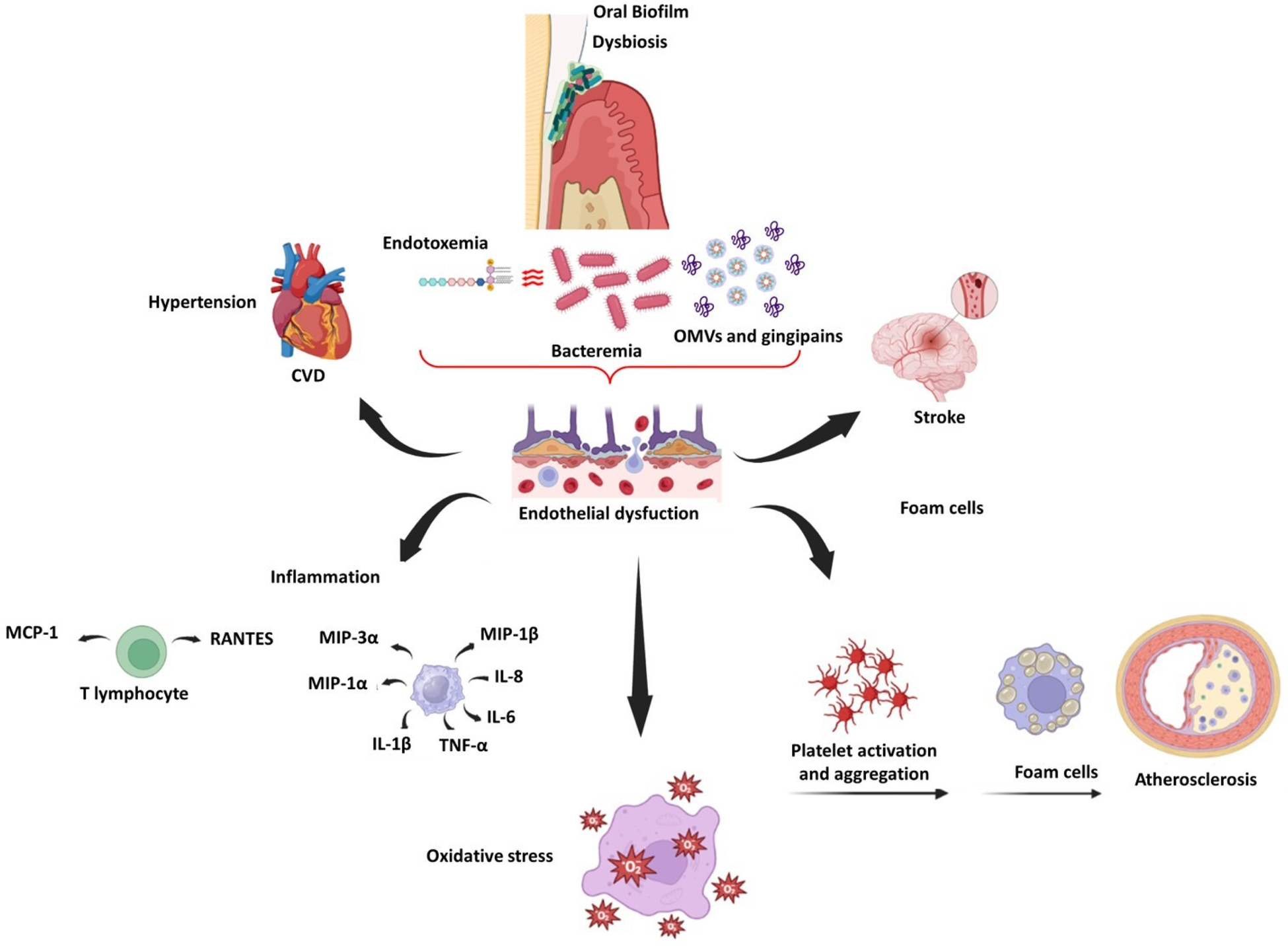 Schematic representation of endothelial dysfunction related to oral dysbiosis, CVDs, and stroke.