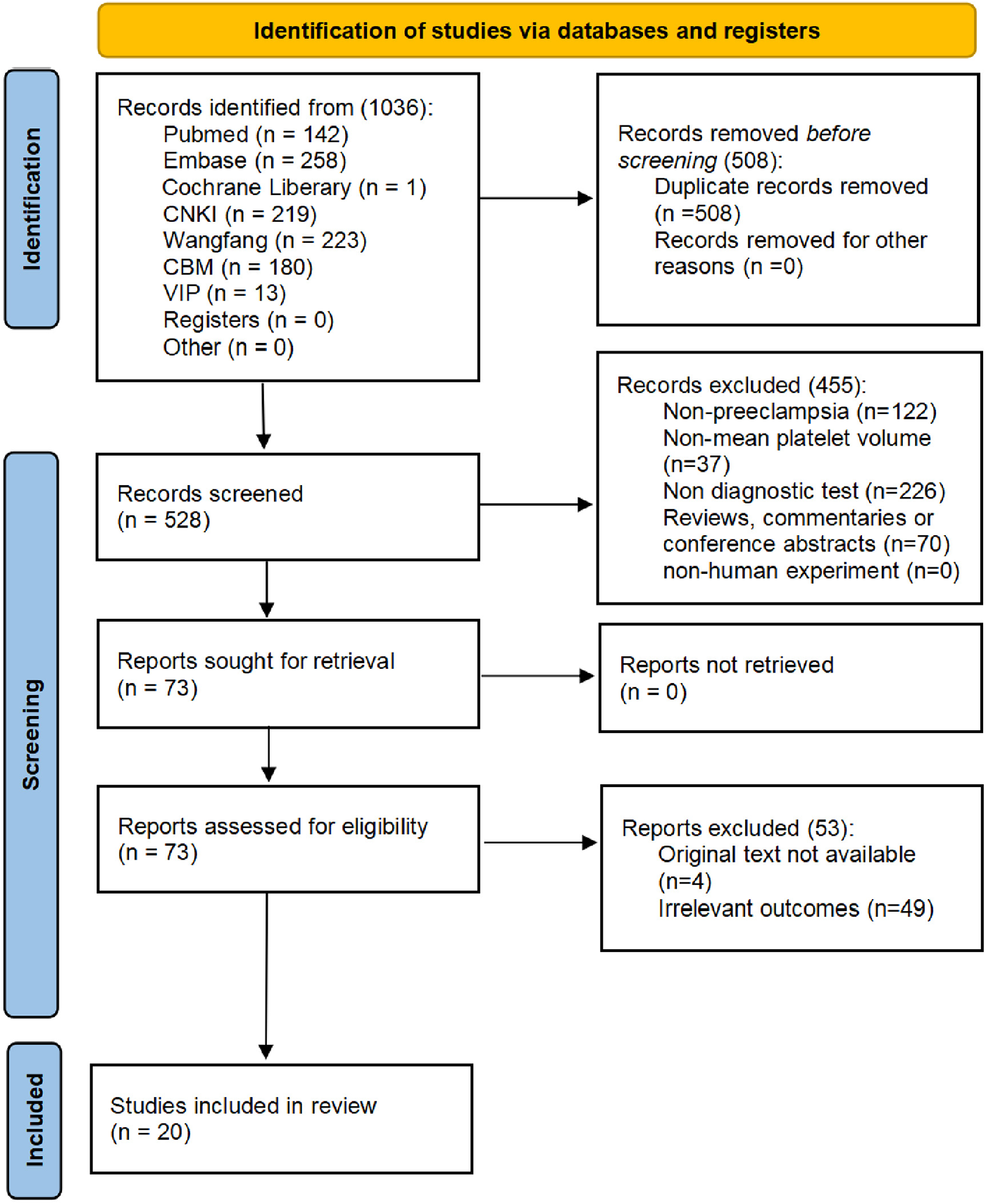 This meta-analysis was based on the Preferred Reporting Items for Systematic Reviews and Meta-Analyses (PRISMA) guidelines (29), and registration was completed with PROSPERO (CRD42023425154). We included diagnostic trials to investigate the predictive and diagnostic value of MPV for PE in pregnant women across all trimesters.