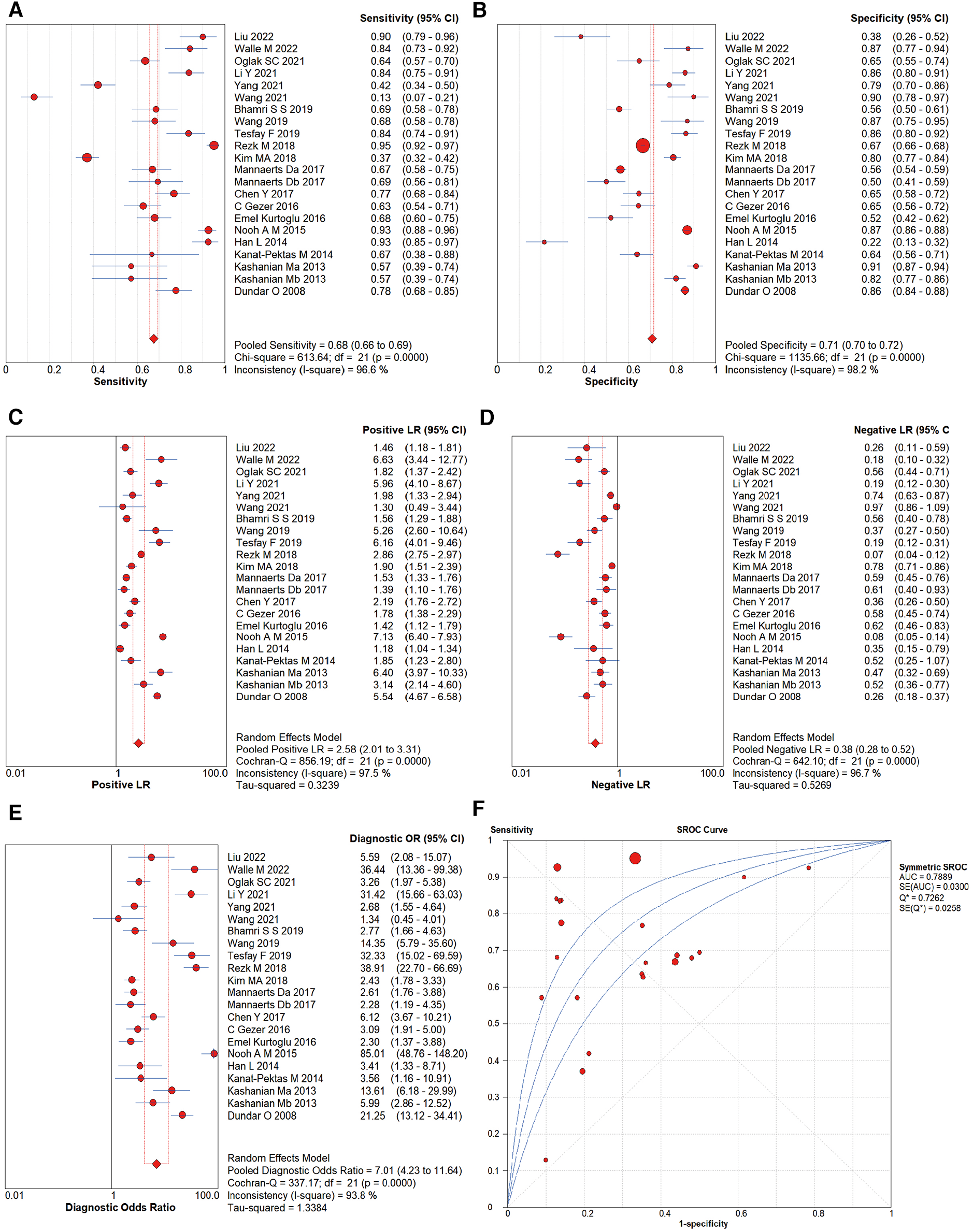 | Total | 22 | 0.676 (0.658–0.694) | 0.710 (0.703–0.717) | 2.576 (2.006–3.308) | 0.381 (0.277–0.523) | 7.012 (4.226–11.636) | 0.7889 ± 0.0300 | |