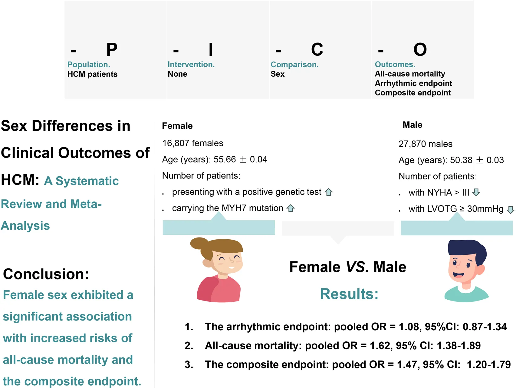 Hypertrophic cardiomyopathy (HCM) is primarily caused by genetic variants affecting sarcomere proteins and inherited in an autosomal dominant manner (1). As a result, the prevalence of HCM in the general population is expected to be similar between the sexes (1). Nevertheless, recent investigations have revealed notable sex disparities in the clinical manifestation, progression, and prognosis of HCM. Specifically, females tend to receive a diagnosis at an older age (≥65 years) and exhibit a higher burden of symptoms (2). Furthermore, they demonstrate a greater prevalence of family history associated with HCM (2). Additionally, females present a heightened frequency of left ventricular outflow obstruction (2). In terms of treatment, women with hypertrophic obstructive cardiomyopathy (HOCM) are less likely to be prescribed beta blockers, angiotensin-converting enzyme inhibitors, or anticoagulants, and have lower rates of implantable cardioverter-defibrillator (ICD) utilization (3). Furthermore, women face an increased risk of heart failure and mortality (3). While Josef Veselka et al. reported a comparable 10-year freedom from all-cause mortality between women and men (76% vs. 80%) following alcohol septal ablation in HOCM (4). Given the divergent results among these studies, this systematic review and meta-analysis was conducted to comprehensively compare the clinical outcomes between females and males in patients diagnosed with HCM.