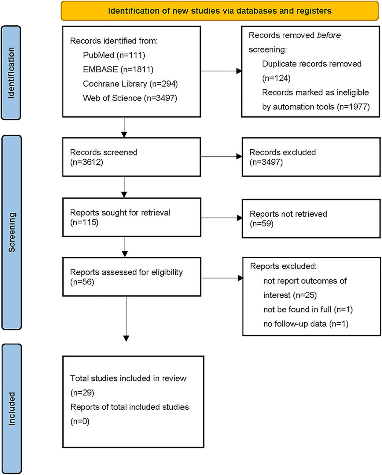 The flowchart depicting the selection process of the meta-analysis is presented in Figure 1. A systematic search of relevant databases yielded an initial total of 5,713 records. After removing duplicates, non-English articles, and studies that did not meet the predetermined inclusion and exclusion criteria (e.g., reviews, case reports, editorials, opinion letters, dissertations, conference proceedings, and original articles that did not align with the research objectives), 56 articles were subjected to a thorough evaluation. Following this screening process, one article could not be accessed in its entirety, one article lacked the necessary follow-up data, and twenty-five articles did not report the specific outcomes of interest. Ultimately, a total of twenty-nine retrospective cohort studies were considered eligible for quantitative analysis (5–33).