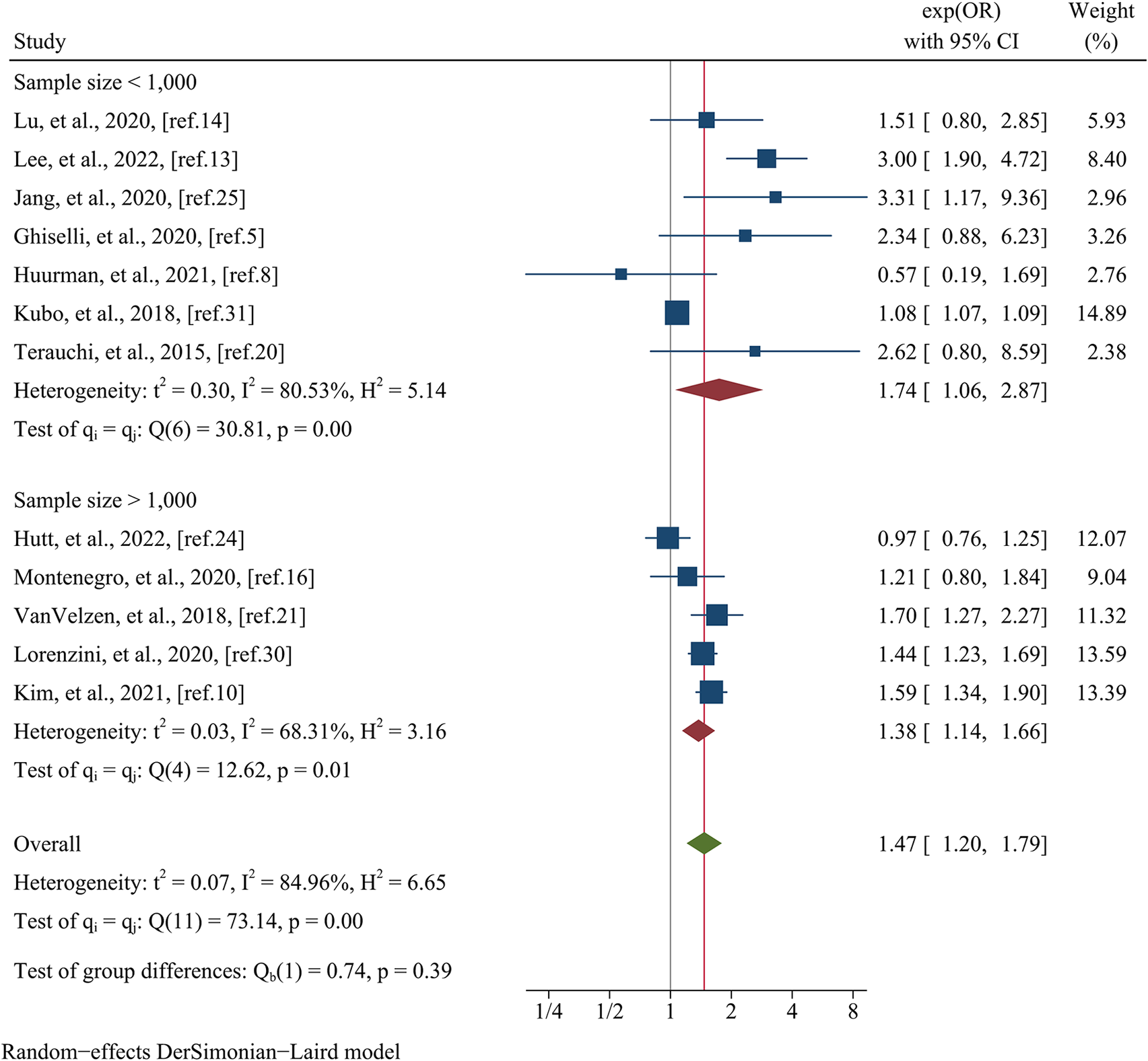 To address the existing heterogeneity across the included studies, a predefined meta-regression analysis and subgroup analysis were conducted. These analyses focused on crucial variables, including mean age (<50 years old or ≥50 years old), follow-up time (<3 years or ≥3 years), sample size (<1,000 or ≥1,000), postoperative patients (yes or no), data matching (yes or no), and the type of estimated effect size (odds ratio, relative risk, or hazard ratio).