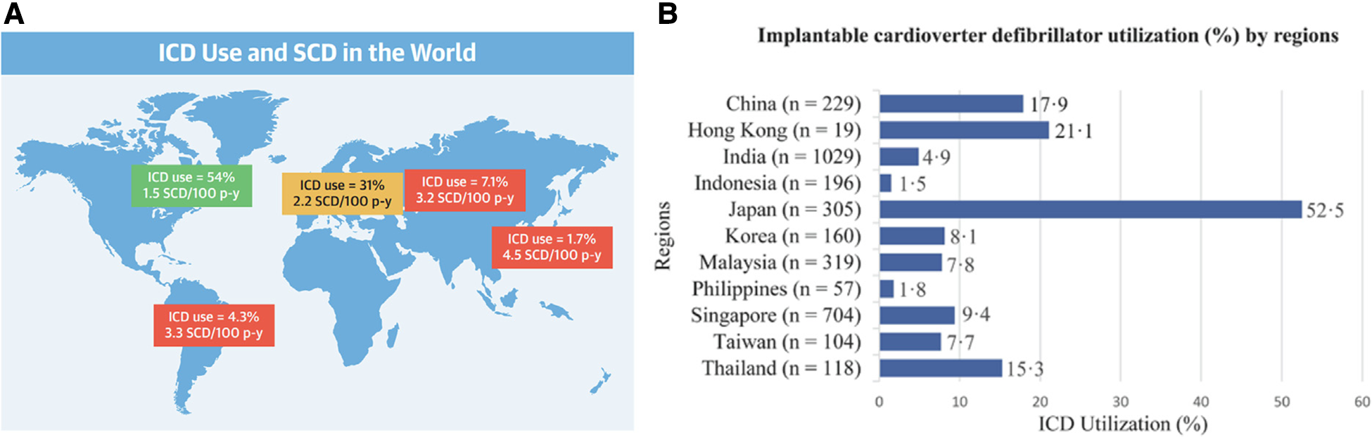 Highlighting differences in implantable cardioverter-defibrillator usage between Asia and western nations. (Panel A) The global landscape of implantable cardioverter-defibrillator (ICD) utilization and sudden cardiac death (SCD) rates portrays significant regional variations. Notably, North America exhibited the highest ICD usage rate (54%), while Asia-Pacific had the lowest rate (1.7%). In terms of pacemaker implantations, there were differences between Asian and White populations in various countries. (Panel B) ICD prevalence varied significantly across Asian countries, with Japan reporting the highest rate (52.5%), followed by Hong Kong (21.1%) and China (17.9%). A large discrepancy was observed as Indonesia reported the lowest rate (1.5%). Reprinted from Ueda et al. (15) with permission.