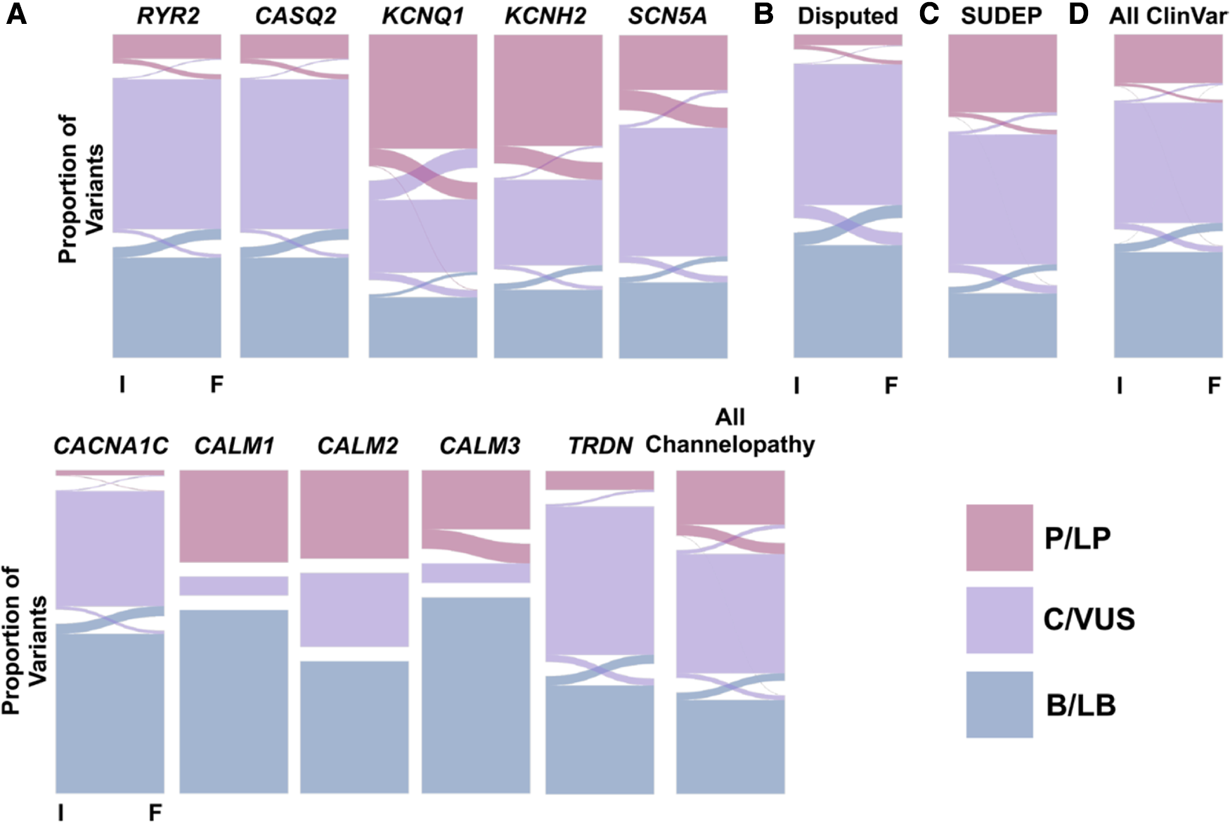 Alluvial plots presenting changes in variant evaluation from initial (I) to final (F) assessment in clinVar for variants that underwent at least two evaluations. Evaluations are categorized into pathogenic/likely pathogenic (P/LP, pink), conflicting interpretations of pathogenicity/variant of uncertain significance (C/VUS, purple), and benign/likely benign (B/LB, blue) buckets. Panel A shows gene-specific alluvial plots for cardiac channelopathy-associated genes. Panel B presents a summary alluvial plot for genes with an uncertain association with long QT syndrome. Panel C showcases a summary alluvial plot for genes linked to sudden unexpected death in epilepsy (SUDEP). Panel D provides a summary alluvial plot encompassing all gene variants in ClinVar. Reprinted from Rosamilia et al. (23) with permission.