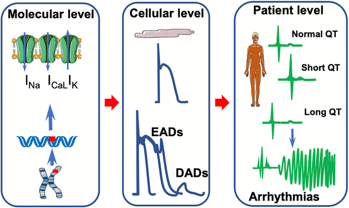 Summary of clinical and physiological features of cardiac ion channelopathies. A schematic representation of the molecular, cellular, and patient levels of channelopathies related to short and long QT syndromes. At the molecular level, gene variants affect ion currents in Na+, Ca2+, and K+ channels. This, in turn, affects the action potential morphology by forming early (EADs) and/or delayed after depolarizations (DADs) at the cellular level. These electrical abnormalities translate into either a short or long QT interval on the surface electrocardiogram predisposing to arrhythmia at the patient level.