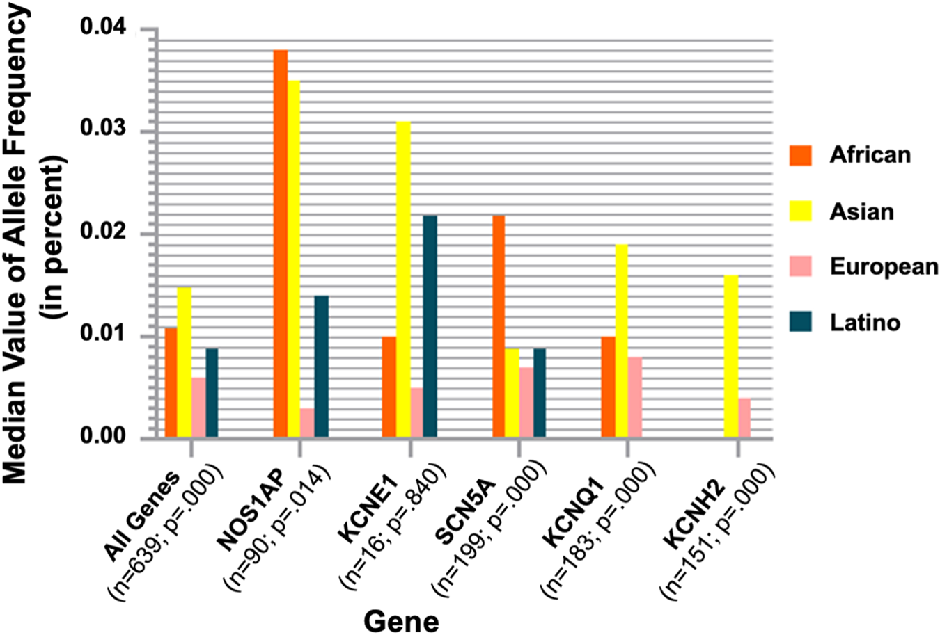 Ethnic group gene analysis from the exome aggregation consortium database. For all genes related to ion channelopathies, the number of alleles (n), the P values, and the median values of allele frequencies across different ethnic groups are shown. Asian populations had the highest proportion of allele frequencies in KCNE1, KCNQ1, and KCNH2. Reprinted from Kong et al. (60) with permission.