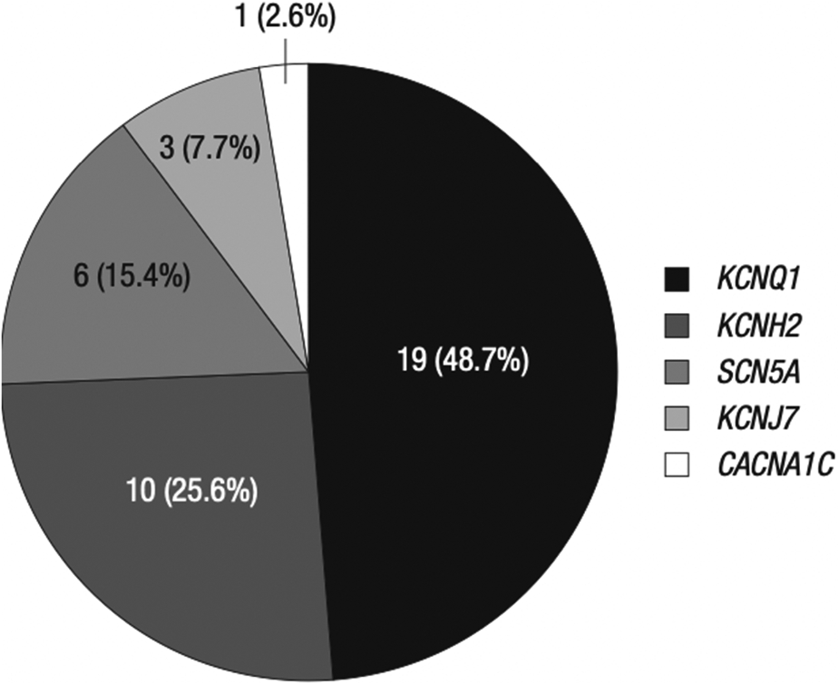 Genetic variants in Korean proband and family group. The studied genes are KCNQ1, KCNH2, SCN5A, KCNJ7, and CACNA1C, corresponding to LQT1, 2, 3, 7, and 8, respectively. KCNQ1 and KCNH2 together account for almost 75% of all genetic variants in the Korean ethnic group. Only 2.6% of the genetic variants were related to CACNA1C. Reprinted from Lee et al. (61) with permission.