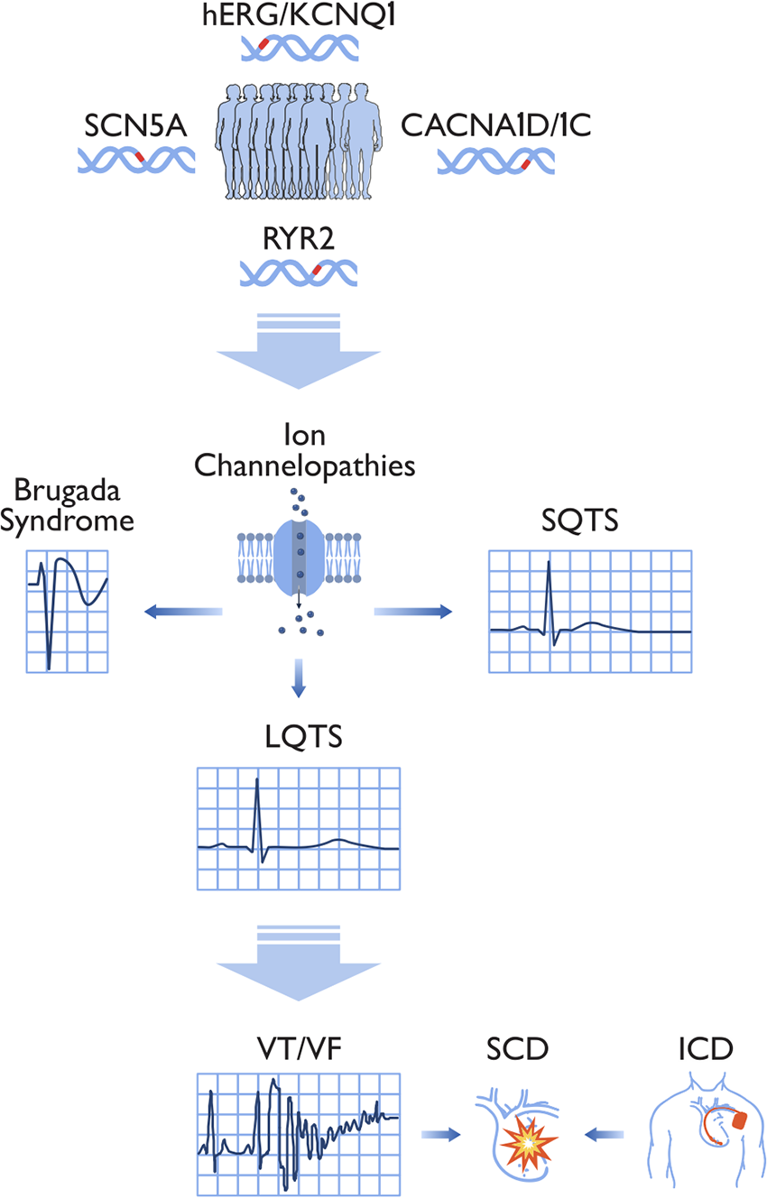 Abbreviations BrS, brugada syndrome; CPVT, catecholaminergic polymorphic ventricular tachycardia; ECG, electrocardiogram; ICD, implantable cardioverter-defibrillator; LQTS, long QT syndrome; QTc, corrected QT interval; RYR2, ryanodine receptor 2; SCD, sudden cardiac death; SQTI, short QT interval; SQTS, short QT syndrome.