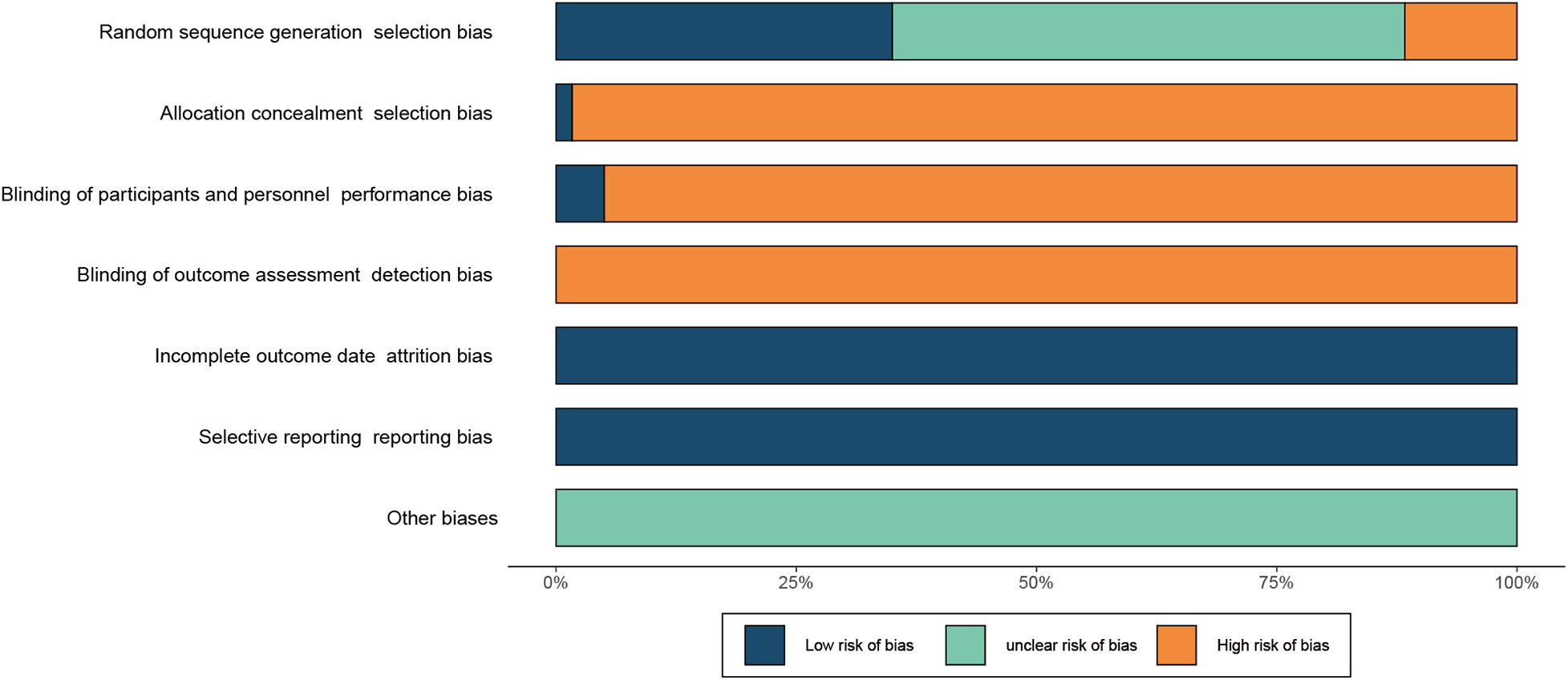 Two investigators evaluated the methodological quality of the included literature based on seven items (random sequence, allocation concealment, blinding of patients and researchers, blinding of outcome evaluators, integrity of outcome data, selective reporting of results, and other sources of bias) in accordance with the RCT risk-of-bias assessment tool in Cochrane Handbook for Systematic Reviews of Interventions (16). Based on the results, each item was rated as low-risk, unclear-risk, or high-risk. As detailed in Supplementary Material S2.
