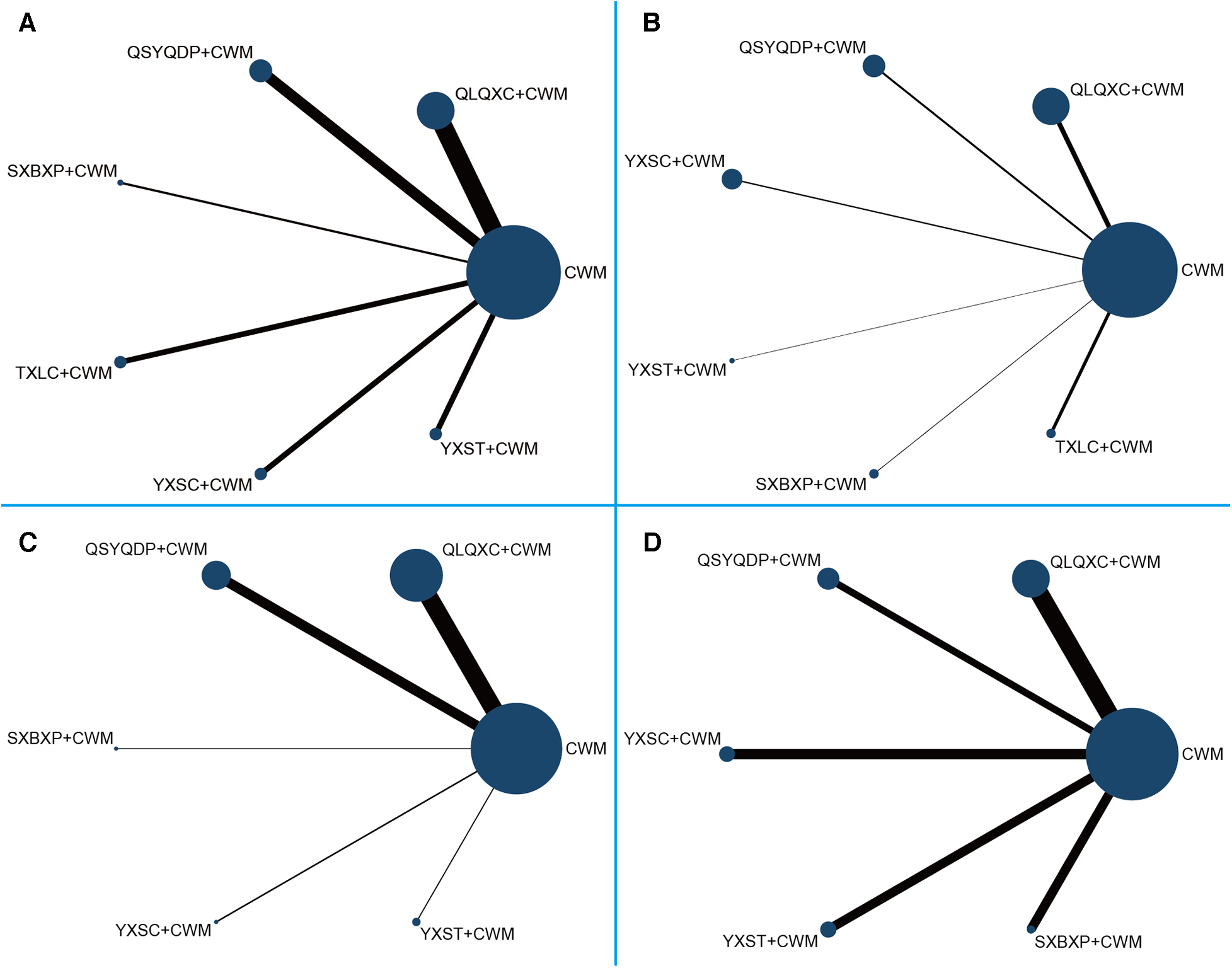 HFpEF is mainly treated with comprehensive methods that target symptoms, cardiovascular diseases, comorbidities, and risk factors (7). The current guideline-recommended pharmacological treatments mainly include diuretics, sodium-glucose cotransporter−2 inhibitors, angiotensin receptor neprilysin inhibitors, mineralocorticoid receptor antagonists and angiotensin II receptor blockers. Nevertheless, only diuretics are recommended as class 1 for symptomatic relief with risks of electrolyte disturbances and renal impairment, and less treatment measure is available that reduces the hospitalization and mortality rates associated with HFpEF (8). In China, traditional Chinese medicine (TCM) has been used to treat cardiovascular diseases for more than 2,000 years. Several studies have systematically evaluated the efficacy and safety of different Chinese traditional patent medicines (CTPMs) in the treatment of HFpEF, showing that conventional Western medicine (CWM) combined with CTPMs can significantly alleviate symptoms and improve efficacyin HFpEF (9–11). Although many CTPMs are available on the market, there are still no clinical studies directly comparing the efficacies of different CTPMs. Therefore, it is difficult for clinicians to choose the best treatment, a situation that is not conducive to the promotion and application of CTPMs in the treatment of HFpEF. Unlike conventional meta-analysis, network meta-analysis (NMA) considers both direct evidence and indirect evidence to evaluate the therapeutic effects of various interventions and rank them according to efficacy, providing a reference and a basis for a clinical intervention, such as CTPMs. Given this background, this study used NMA to compare and rank the differences in the therapeutic effects of various CTPMs for treating HFPEF with regard to different outcome indicators to provide medical evidence for the development of clinical treatment plans.