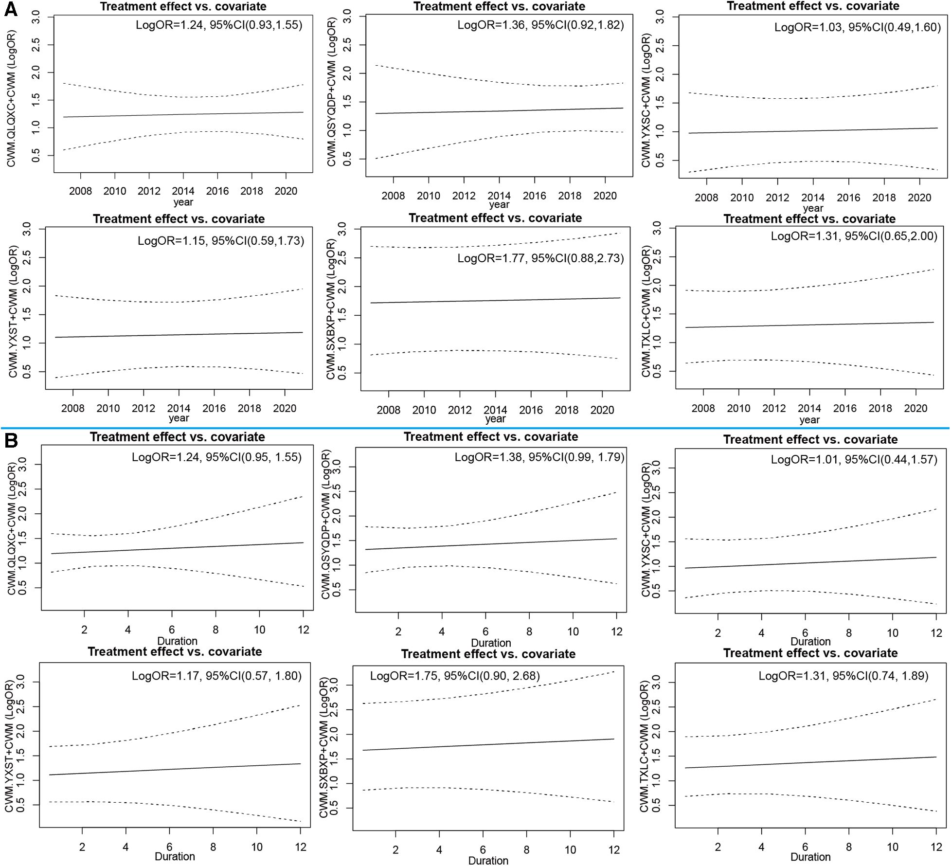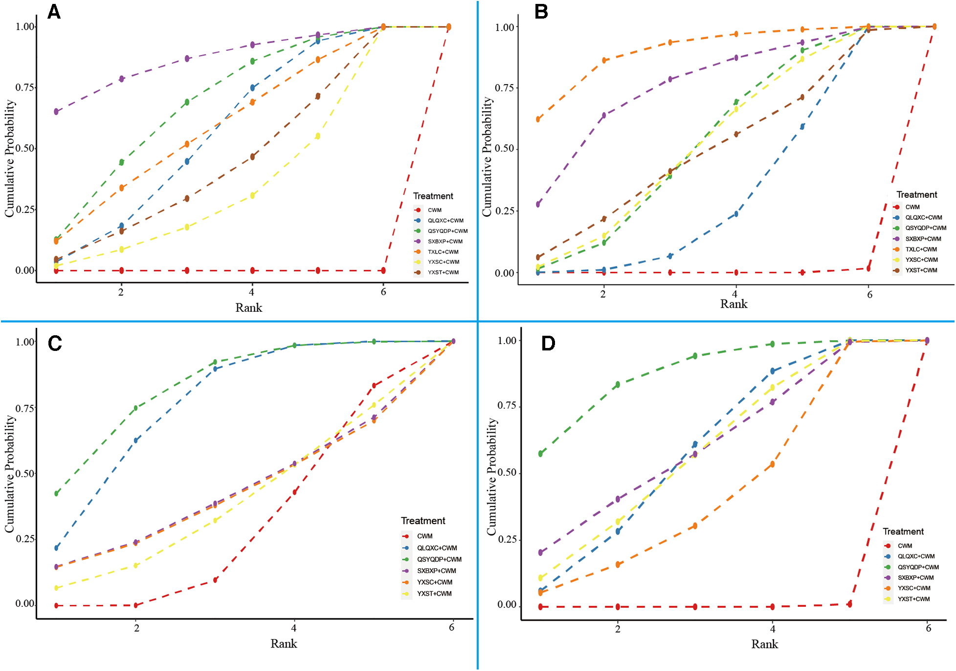 Patients in the control group were treated with CWM or CWM plus placebo, and each CWM treatment followed the relevant guidelines for each medication. Basic drug therapy for HFpEF includes diuretics, mineralocorticoid receptor antagonist, angiotensin receptor blocker, angiotensin receptor nprilysin inhibitor, or sodium glucose cotransporter−2 inhibitor. Patients in the experimental group were treated with a CTPM combined with the treatment received by the control group. The CTPMs used were approved by the National Medical Products Administration of China (NMPA), with no restrictions regarding drug indications but with sufficient research data (≥5 RCTs for a single CTPM).