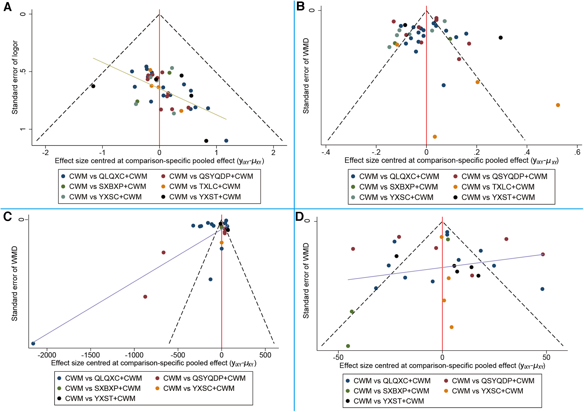 Bayesian NMA was conducted using a Markov chain Monte Carlo method (17). The initial value was set at 2.5 using four Markov chains. A total of 10,000 preiterations were conducted, followed by 50,000 iterations to achieve model convergence. When the potential scale reduction factor (PSRF) approached 1, the model converged satisfactorily; otherwise, the number of iterations was increased. The evidence network diagram of each result was drawn to visualize the connections between different interventions. When there was a closed loop, inconsistency between the direct and indirect evidence was detected using node splitting. To measure effect size, binary data are expressed as the odds ratio (OR), continuous data are expressed as the weighted mean difference (WMD) with the 95% confidence interval (CI). The random-effects model was used for data merging. P < 0.05 was considered statistically significant. The efficacies of different interventions were ranked according to the surface under the cumulative ranking curve (SUCRA) (18). Network meta-regression analysis with year of publication and duration of treatment as covariates was performed to determine whether these factors had any effect on the results. The effect size of multiple outcome indicators was summed, and multidimensional efficacy analysis was performed to identify the best intervention. Publication bias was assessed by funnel plots. The Bayesian NMA was performed using the GeMTC package in R (version 4.1.2).