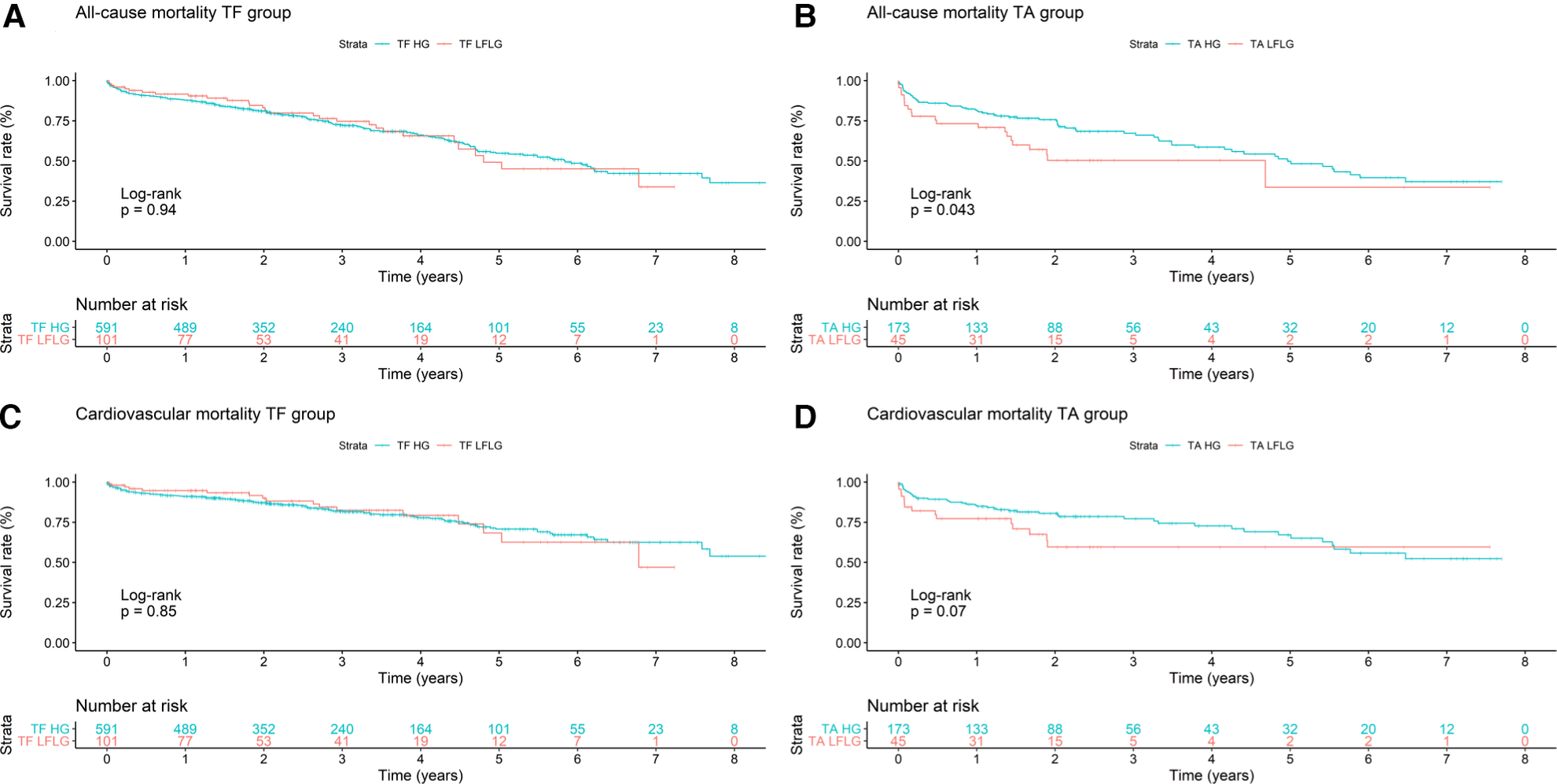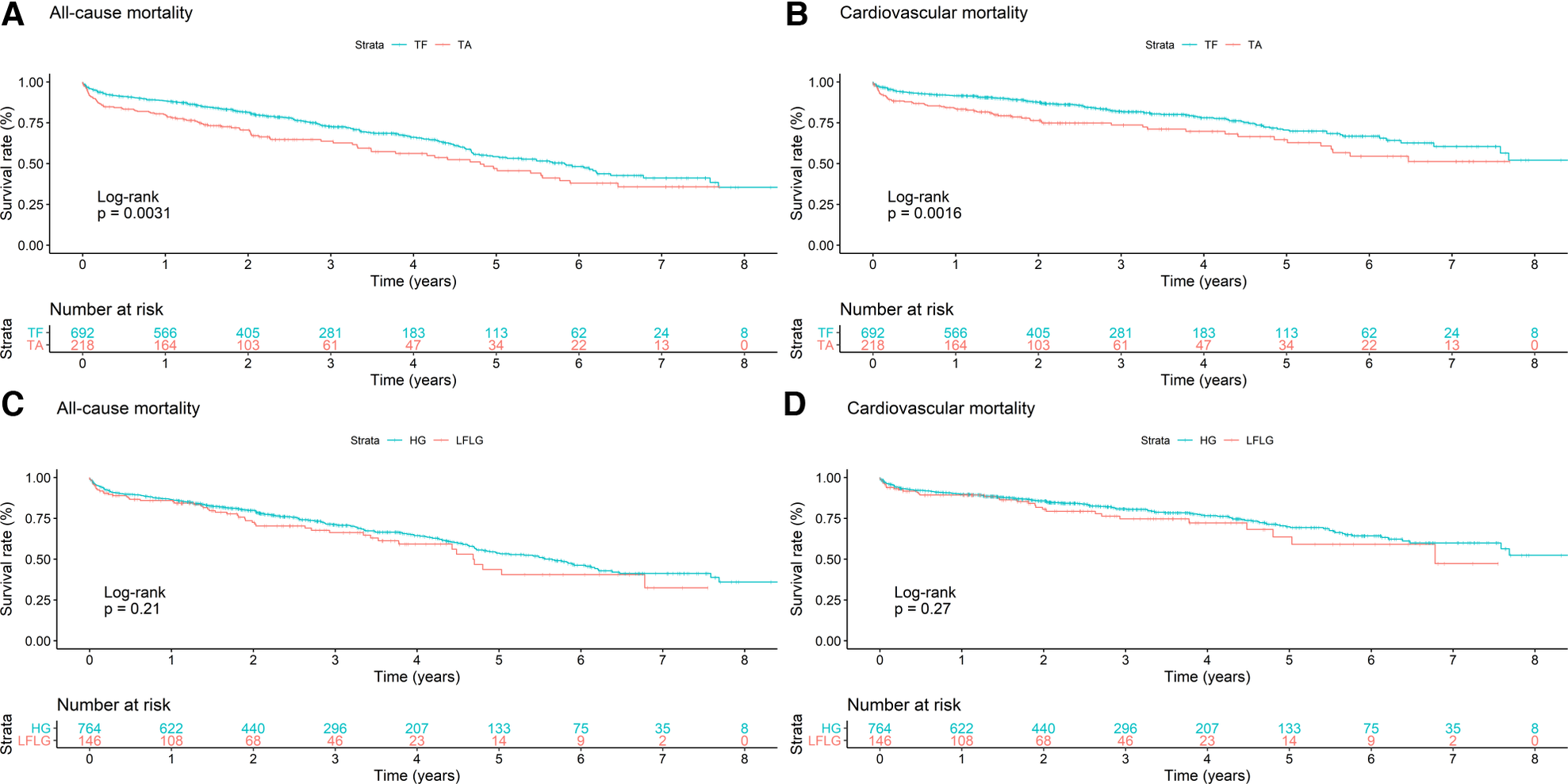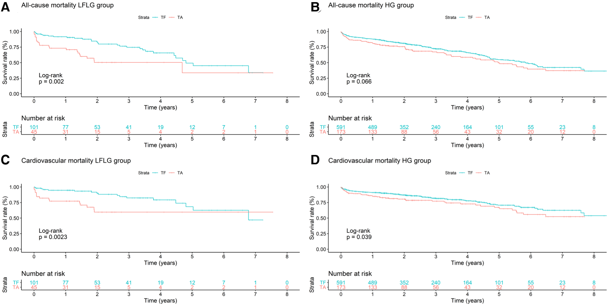 A total of 910 patients, who underwent either TF or TA TAVR with a median follow-up of 2.22 (IQR: 1.22–4.03) years, were included in this multicenter cohort study. In total, 146 patients (16.04%) suffered from LFLG AS. The patients with HG and LFLG AS were stratified according to the route of access and compared statistically.