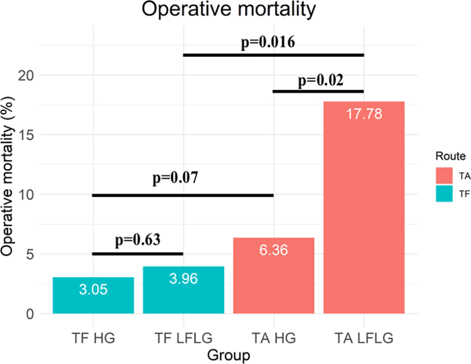 The operative mortality rates of patients with HG and LFLG were found to be comparable following TF access. The operative mortality rate was significantly increased for patients who underwent TA access [odds ratio (OR): 2.91 (1.54–5.48), p = 0.001] and patients with LFLG AS [OR: 2.27 (1.13–4.56), p = 0.02], which could be corroborated in a propensity score-matched subanalysis. The observed increase in the risk of operative mortality demonstrated an additive effect [OR for TA LFLG: 5.45 (2.35–12.62), p < 0.001]. LFLG patients who underwent TA access had significantly higher operative mortality rates (17.78%) compared with TF LFLG (3.96%, p = 0.016) and TA HG patients (6.36%, p = 0.024).