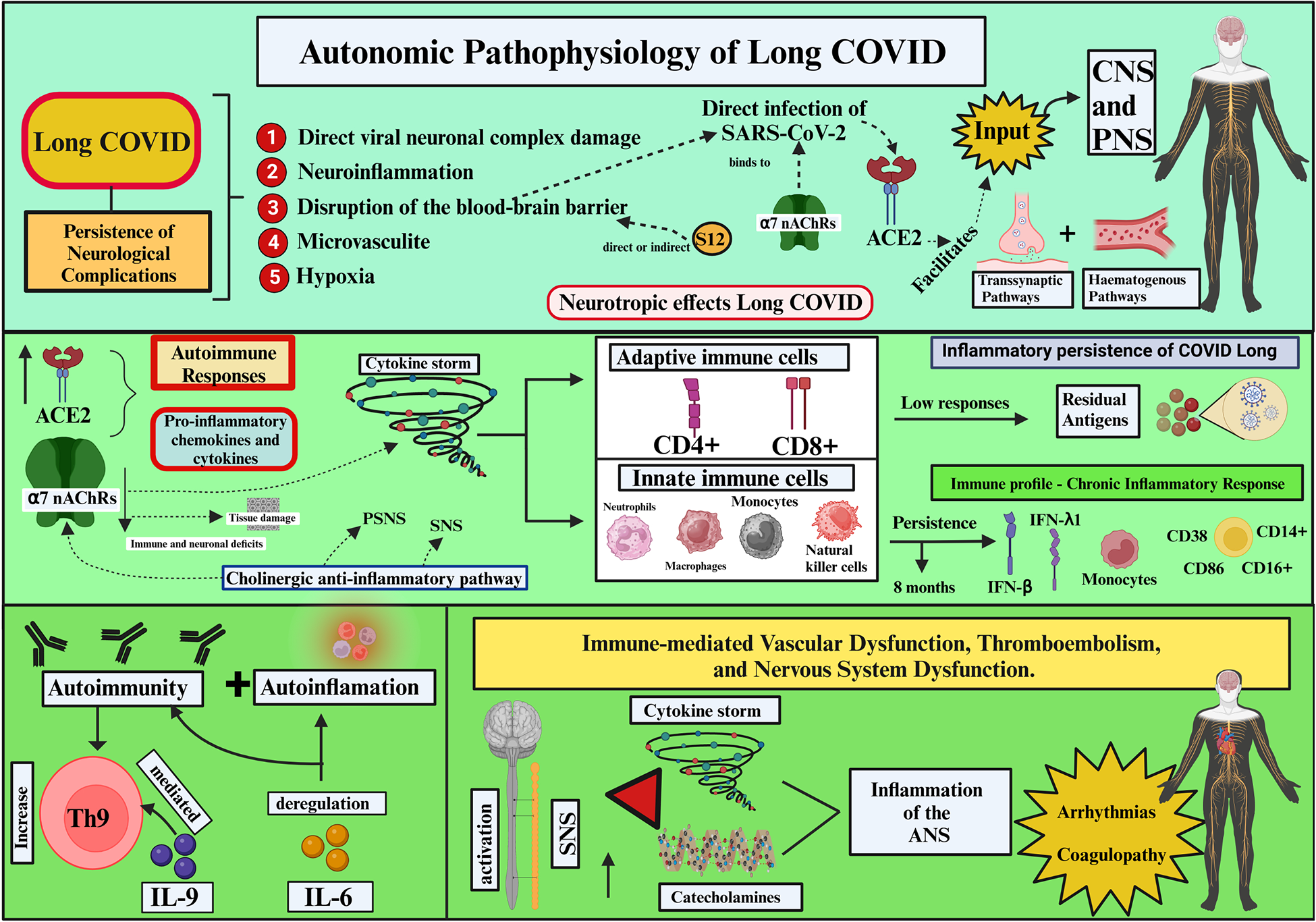 Autonomic Pathophysiology of Long COVID (Created with BioRender.com). SARS-CoV-2, severe acute respiratory syndrome coronavirus 2; ACE2, angiotensin-converting enzyme 2; S12, SARS-CoV-2 spike protein; α7 nAChRs, α7 nicotinic acetylcholine receptors; CNS, central nervous system; PNS, peripheral nervous system; PSNS, parasympathetic nervous system; SNS, sympathetic nervous system; CD4+, T lymphocyte CD4+; CD8+, T lymphocyte CD8+; type III interferon (IFN-β, -γ1), T lymphocyte types: CD38, CD86, CD14α, CD16α; IL-9, interleukin 9; IL-6, interleukin 6; ANS, autonomic nervous system.