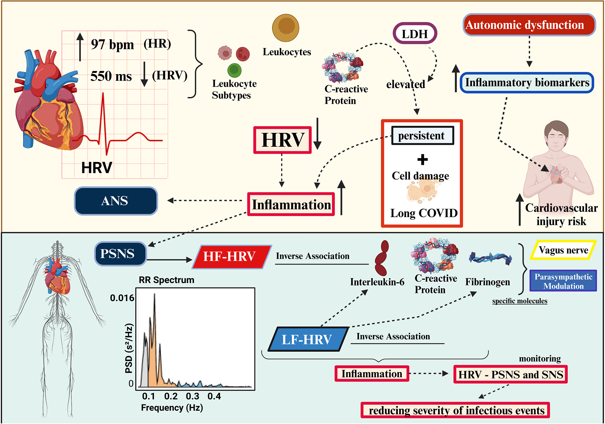 Association of heart rate variability and inflammatory markers (created with BioRender.com). HRV, heart rate variability; LDH, lactate dehydrogenase; ANS, autonomic nervous system; PNS, peripheral nervous system; PSNS, parasympathetic nervous system; SNS, sympathetic nervous system; HF-HRV, high-frequency HRV; LF-HRV, low-frequency HRV.