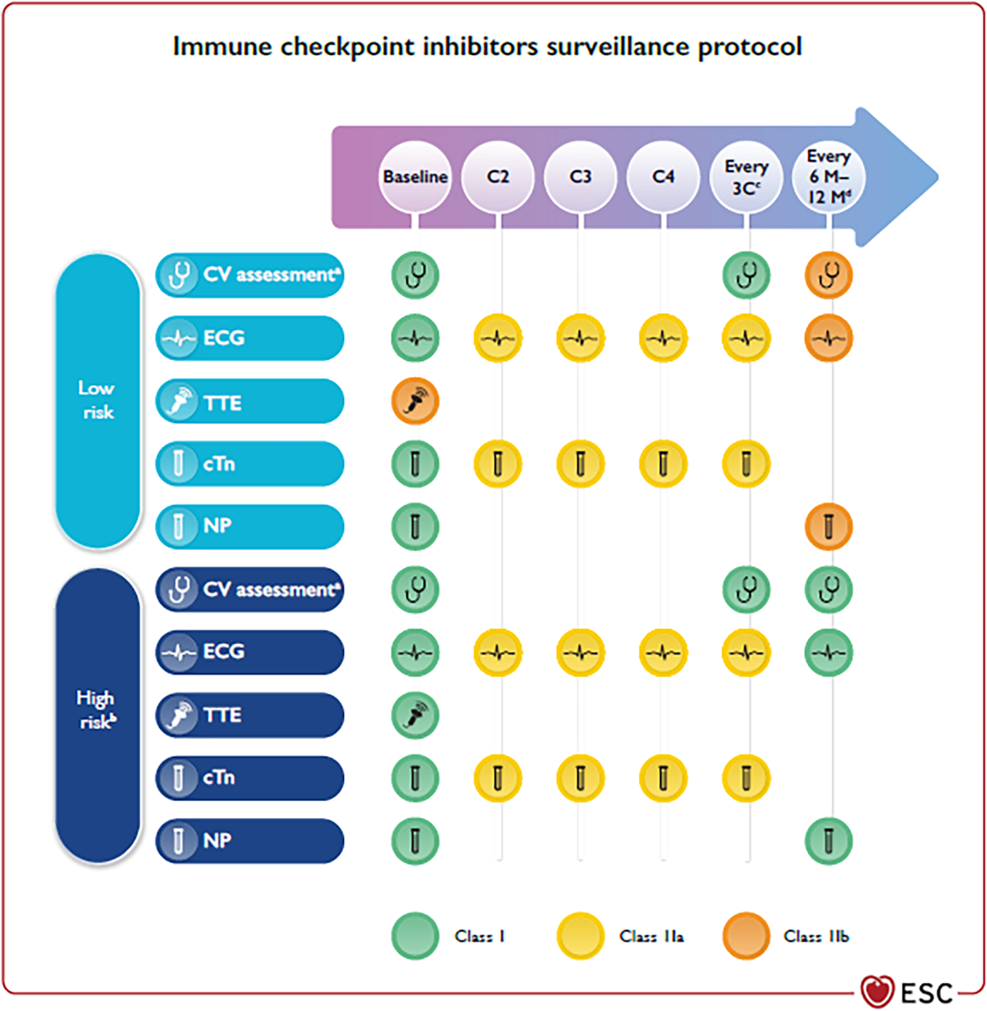 (reproduced with permission from 9). Cardiovascular surveillance in patients treated with immune checkpoint inhibitors. BNP, B-type natriuretic peptide; BP, blood pressure; C, chemotherapy cycle; cTn, cardiac troponin; CV, cardiovascular; CVD, cardiovascular disease; CTRCD, cancer therapy-related cardiac dysfunction; CTR-CVT, cancer therapy-related cardiovascular toxicity; CVRF, cardiovascular risk factors; ECG, electrocardiogram; HbA1c, glycated haemoglobin; ICI, immune checkpoint inhibitors; M, months; NP, natriuretic peptides (including BNP and NT-proBNP); NT-proBNP, N-terminal pro-B-type natriuretic peptide; TTE, transthoracic echocardiography; AF, atrial fibrillation. aIncluding physical examination, BP, lipid profile, and HbA1c. bDual ICI, combination ICI-cardiotoxic therapy, ICI-related non-CV events, prior CTRCD or CVD. cEvery three cycles until completion of therapy to detect subclinical ICI-related CV toxicity. dIn patients who require long-term (>12 months) ICI treatment.