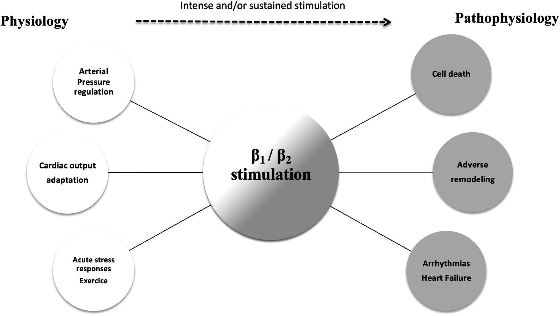 The physiologic and pathophysiologic role of the beta-adrenergic pathway. The role of beta-adrenergic stimulation in cardiac physiology is pivotal (white circles). Intense and sustained stimulation (dotted arrow) are presumed to be responsible for the deleterious effects observed in patients with severe heart failure (gray circles).