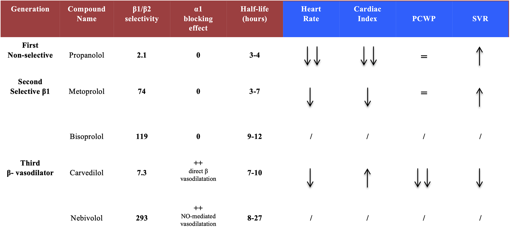 Pharmacological properties of the different beta-blocker generations. Second and third generations show a greater β1 selectivity and, for third generation compounds, an additional vasodilatory activity. Acute hemodynamic effects reveal a safer profile with carvedilol (as compared to others) regarding cardiac index and systemic vascular resistances. PCWP, pulmonary capillary wedge pressure; SVR, systemic vascular resistance.