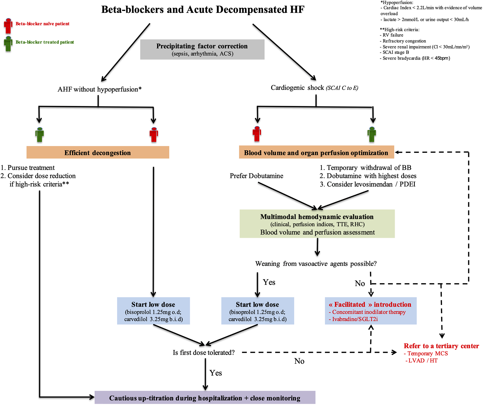 For over 20 years, BB have been the cornerstone therapy for stable HFrEF. However, its management in the setting of AHF remains challenging. The different approaches are highly dependent on patient's clinical phenotype as well as the existence of prior BB therapy. We aimed to provide a concise algorithm based on these two major considerations.