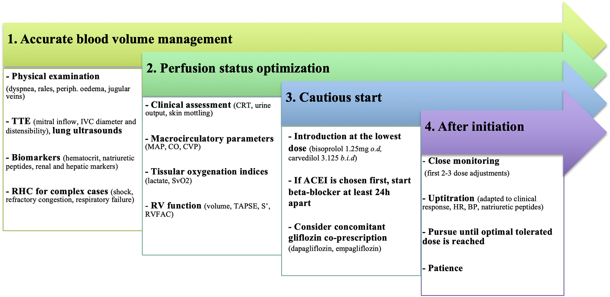 Any condition that may compromise treatment tolerance should be carefully addressed. Initiating BB in unstable conditions will result in variable degrees of HF worsening, ranging from congestion to new shock development and stressing the need for close monitoring. In addition to factors that can jeopardize a previously stable condition (sepsis, arrhythmias, or acute coronary syndromes), the most common factor is an inaccurate hemodynamic evaluation. Clinicians must carefully assess inadequate decongestion, persistent clinical/biological hypoperfusion, and misestimation of RV dysfunction through a multimodal evaluation.