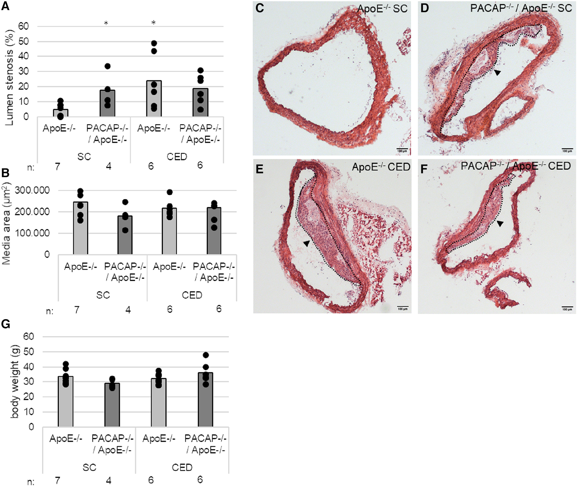 To generate PACAP knockout mice (PACAP−/−), PACAP was deleted from the PACAP gene locus in C57BL/6 mice (30). Then, PACAP knockout mice (PACAP−/−) were crossbred with ApoE−/− (Charles River, Sulzfeld, Germany) to generate PACAP−/−/ApoE−/− mice (29). For this study, only male homozygous PACAP−/−/ApoE−/− and ApoE−/− mice were used, which were fed either standard chow for 30 weeks (SC, LASQCdiet® Rod16 Rad; LASvendi, Soest, Germany) or were fed a cholesterol-enriched diet [CED; “western-type diet” (21% fat, 0.15% cholesterol, and 19.5% casein), Altromin GmbH, Lage, Germany] for an additional 20 weeks at 10 weeks of age. All animals had ad libitum access to water and feed in their cages which had a minimum area of 100 cm2 and an adequate enrichment device. The procedures were approved by the Regierungspräsidium Gießen (V54–19 c 2015 h 01 MR 20/26 No. 21/2014) and complied with the regulations for animal experiments at the Philipps-University Marburg.