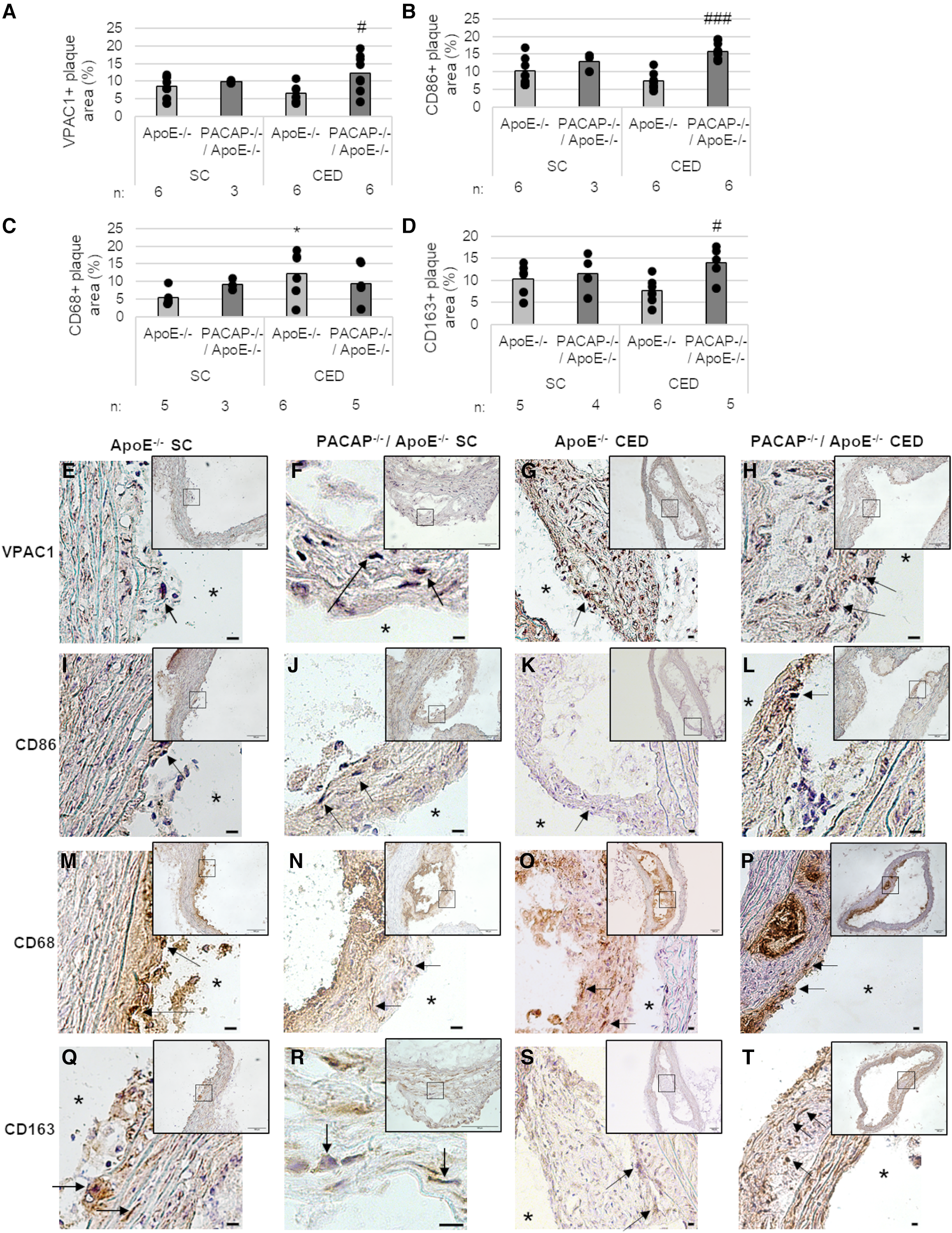In vivo, after 30 weeks of SC, PACAP−/−/ApoE−/− mice showed increased lumen stenosis compared with ApoE−/− mice. In atherosclerotic plaques of PACAP−/−/ApoE−/− mice under CED, immunoreactive areas of VPAC1, CD86, and CD163 were increased compared with ApoE−/− mice. In vitro, VPAC1 protein levels were increased in PACAP−/−/ApoE−/− BMDM compared with ApoE−/− BMDM, resulting in increased TNF-α mRNA expression in BMDM1-MΦ and decreased TNF-α release in BMDM2-MΦ. Concerning lipid homeostasis, PACAP deficiency decreased the area of lipid droplets in BMDM1-/M2-MΦ with concomitant increasing adipose differentiation-related protein level. In THP-1 M1-/M2-MΦ, the VPAC1 antagonist increased the uptake of oxLDL, whereas the VPAC1 agonist decreased the oxLDL-induced intracellular triglyceride content.