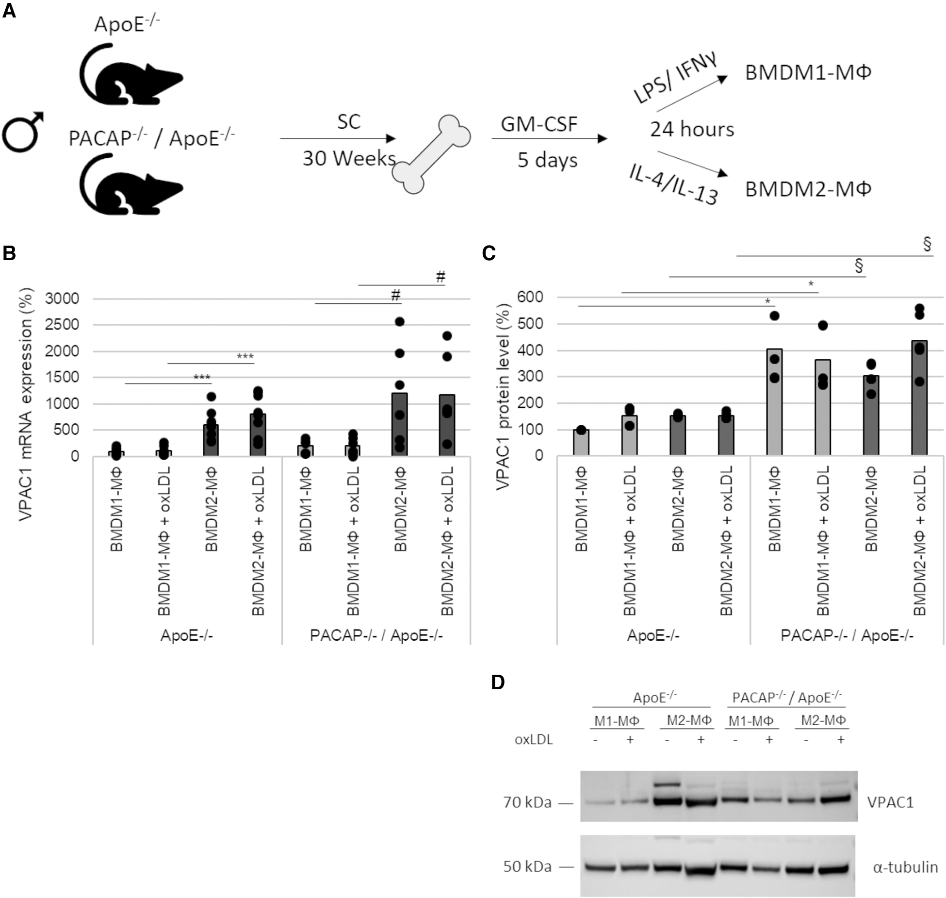 In this context, this study investigated the expression of PACAP and the PACAP receptor VPAC1 concerning lipid homeostasis and inflammatory processes in M1-/M2-MΦ. Our data show that PACAP regulates VPAC1 protein levels, which has implications for cellular inflammatory processes and affects lipid homeostasis in MΦ subtypes. Therefore, we consider it fundamental to further investigate the efficacy of VPAC1 or PACAP in regards to anti-atherogenic therapeutics.