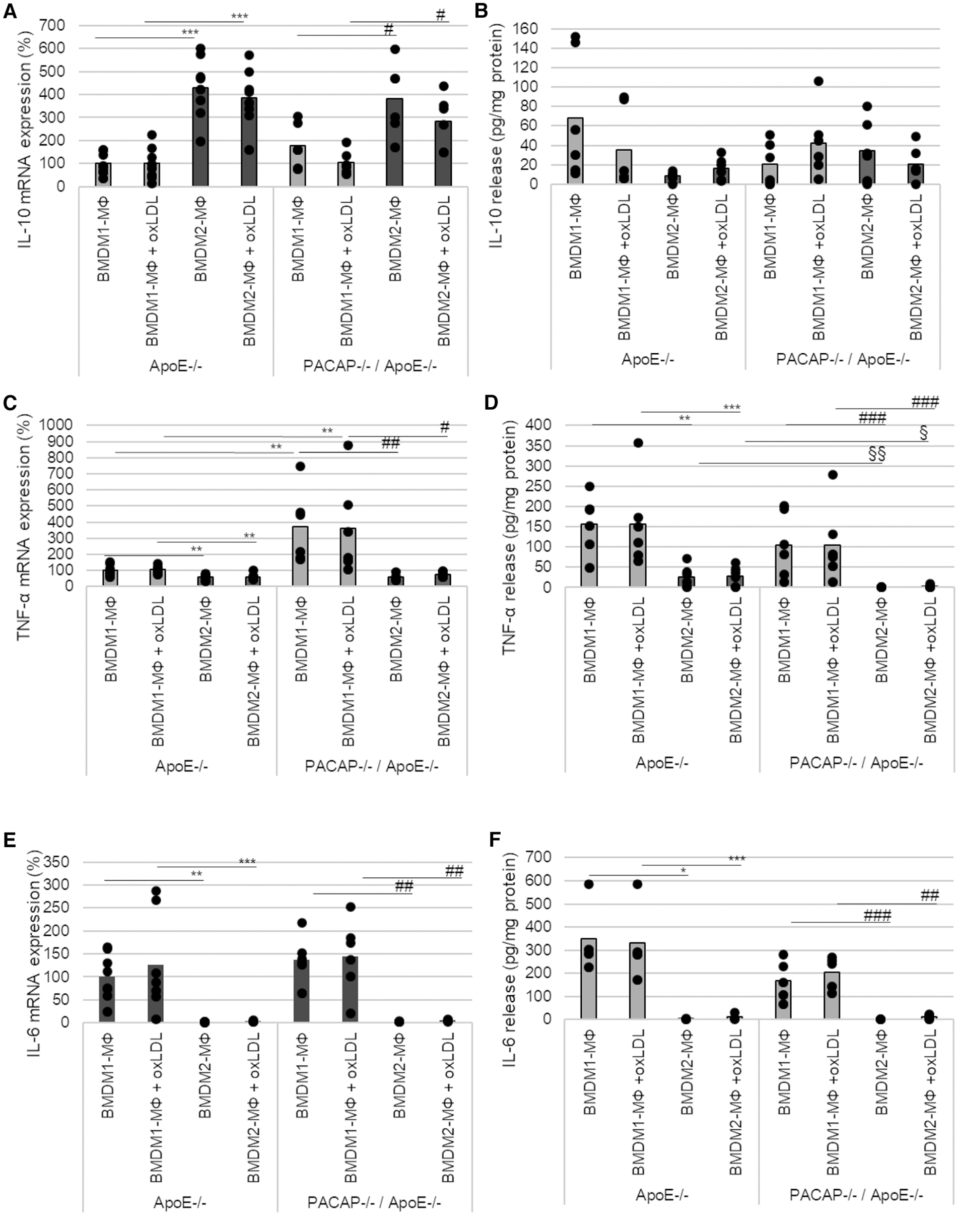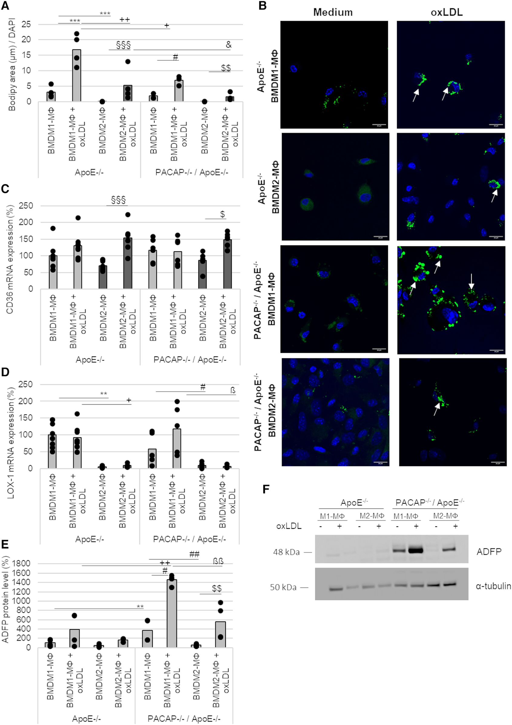 To investigate the role of PACAP deficiency in the pathogenesis of atherosclerosis under standard chow (SC) or cholesterol-enriched diet (CED) in vivo, PACAP−/− mice were crossbred with ApoE−/− to generate PACAP−/−/ApoE−/− mice. Lumen stenosis in the aortic arch and different MΦ-subtypes were analyzed in atherosclerotic plaques by quantitative immunohistochemistry. Undifferentiated bone marrow-derived cells (BMDC) from 30-weeks-old ApoE−/− and PACAP−/−/ApoE−/− mice were isolated, differentiated into BMDM1- and BMDM2-MΦ, and incubated with oxidized low-density lipoprotein (oxLDL). In addition, PMA-differentiated human THP-1 MΦ were further differentiated into M1-/M2-MΦ and subsequently treated with PACAP38, the VPAC1 agonist [(Ala11,22,28)VIP], the antagonist (PG 97–269), and/or oxLDL. Uptake/accumulation of oxLDL was analyzed by oxLDL-DyLight™488 and Bodipy™ 493/503. The mRNA expression was analyzed by qRT-PCR, protein levels by Western blot, and cytokine release by ELISA.