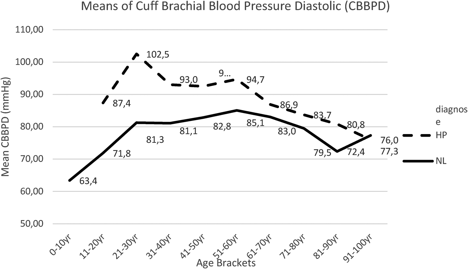 Mean CBBPD for each age bracket within NL and HP groups; NL, normal healthy subjects, HP, hypertensive patients; CBBPD, cuff brachial blood pressure diastolic.