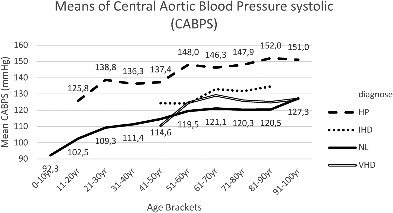 Mean CABPS for each age bracket within NL and HP groups. NL, normal healthy subjects, HP, hypertensive patients; IHD, ischemic heart disease, VHD, valvular heart disease; CABPS, central aortic blood pressure systolic.