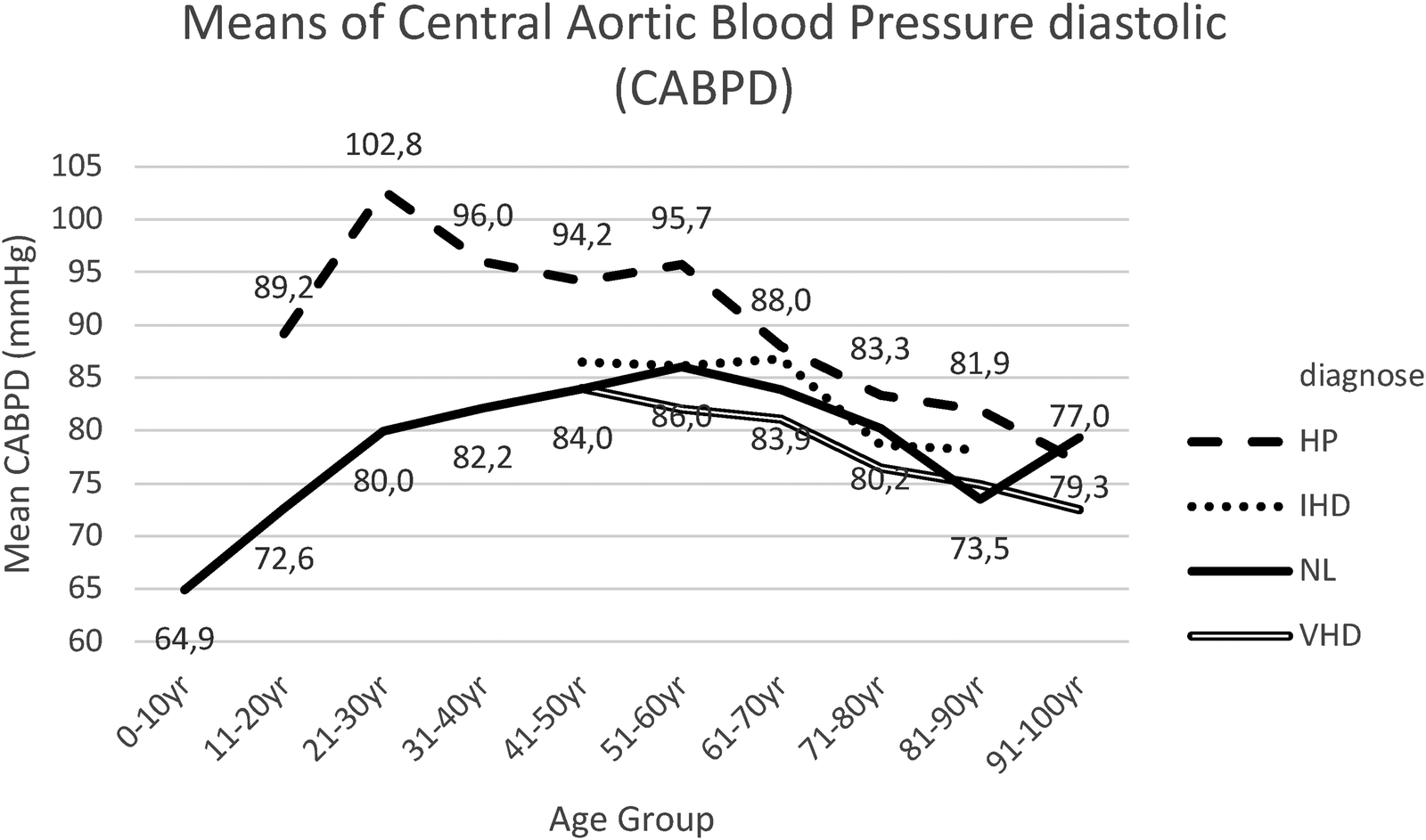 Mean CABPD for each age bracket within NL and HP groups. NL, normal healthy subjects, HP, hypertensive patients; IHD, ischemic heart disease, VHD, valvular heart disease; CABPS, central aortic blood pressure diastolic.