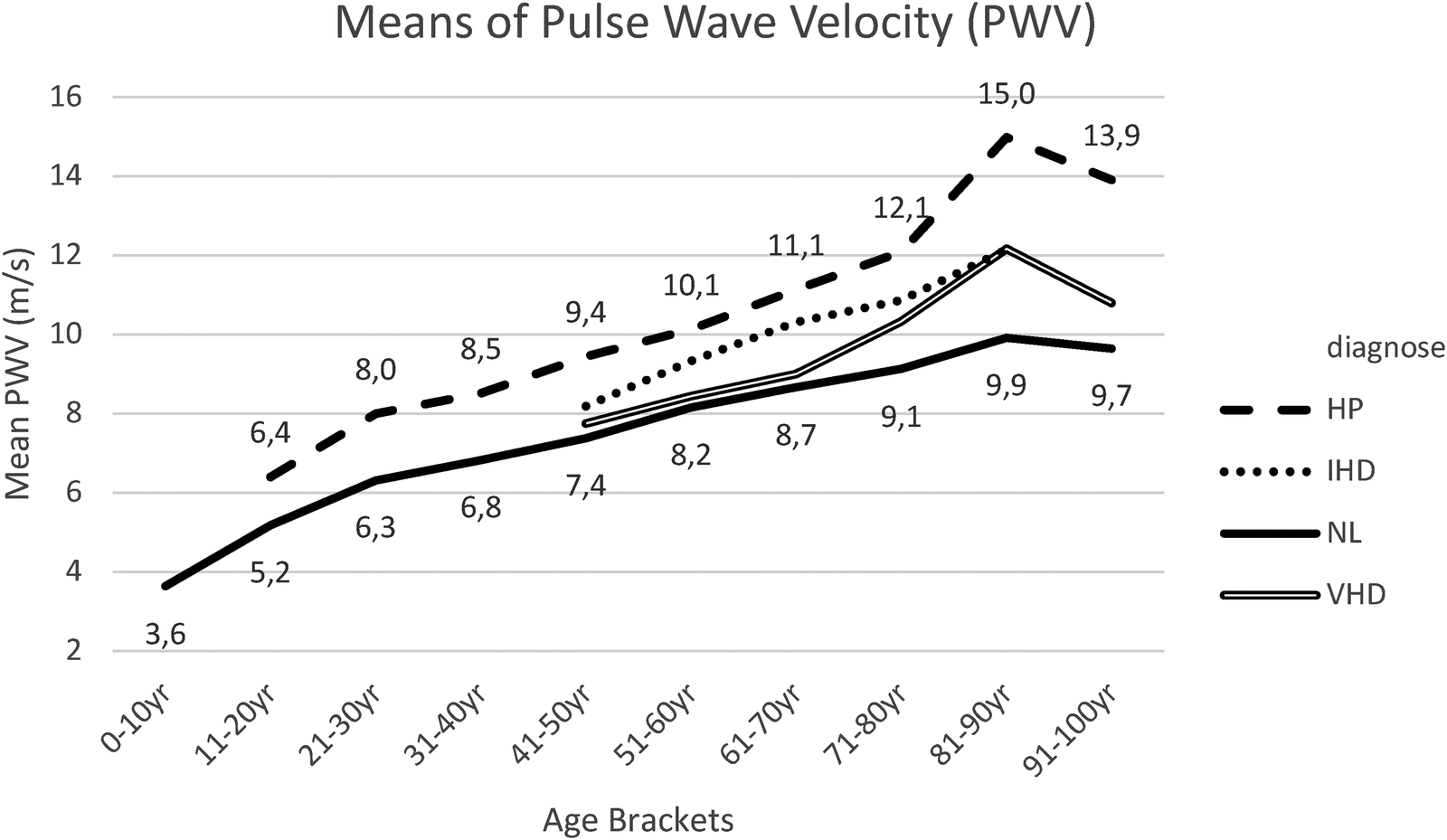 Mean PWV for each age bracket within NL and HP groups. NL, normal healthy subjects, HP, hypertensive patients; IHD, ischemic heart disease, VHD, valvular heart disease; PWV, pulse wave velocity.