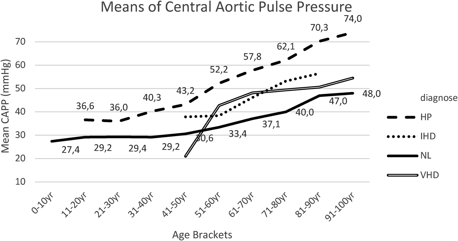Mean CAPP for each age bracket within NL and HP groups. NL, normal healthy subjects, HP, hypertensive patients; IHD, ischemic heart disease, VHD, valvular heart disease; CAPP, central aortic pulse pressure.