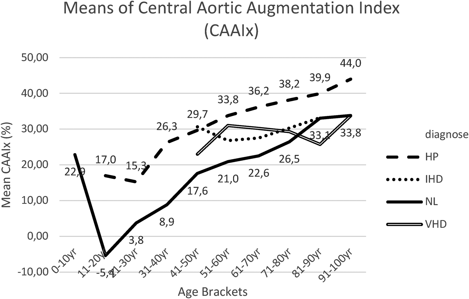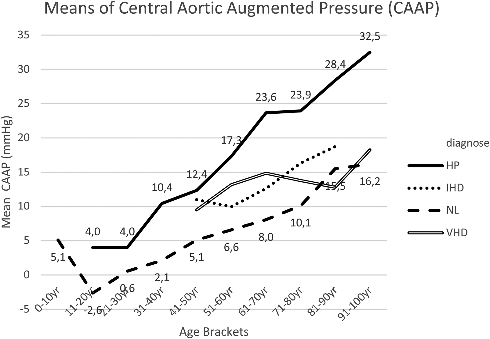 Mean CAAP for each age bracket within NL and HP groups. NL, normal healthy subjects, HP, hypertensive patients; IHD, ischemic heart disease, VHD, valvular heart disease; CAAP, central aortic augmented pressure.