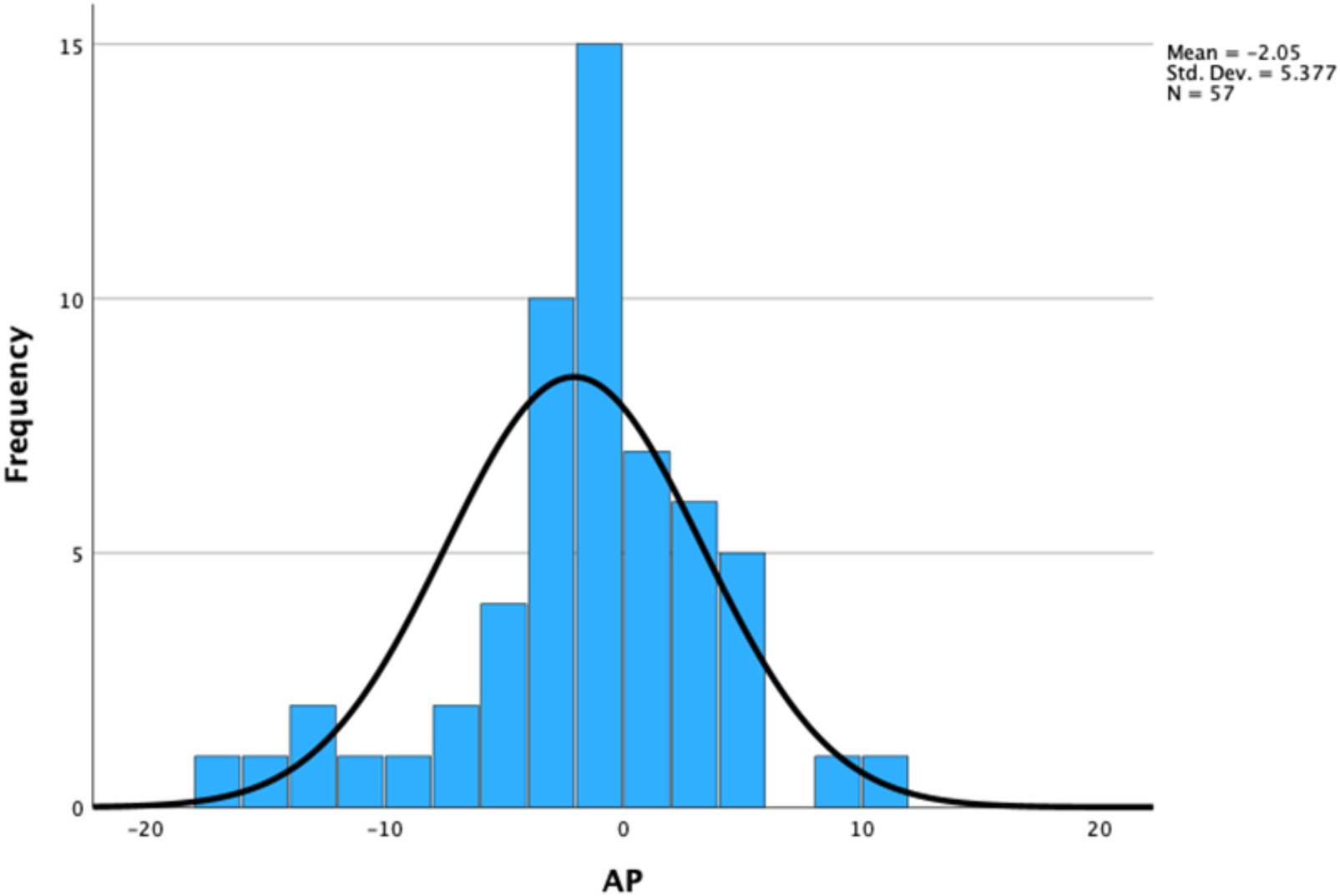 Within the age bracket of 11–20 years, this study investigated CAAP in 69 normal healthy subjects (NL). Following 99% confidence interval testing, this study found an outlier with a CAAP value of +12 mmHg and a second outlier with a CAAP value of −19 mmHg (Figure 8).