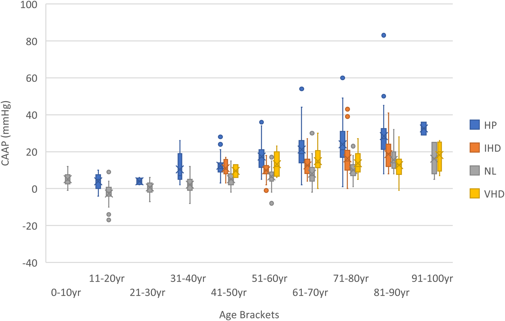 CAAP increased linearly with age. Statistically significant differences between group I healthy subjects (NL) and group II hypertensive patients (HP), were progressively more pronounced within the older age bracket (Figure 7).