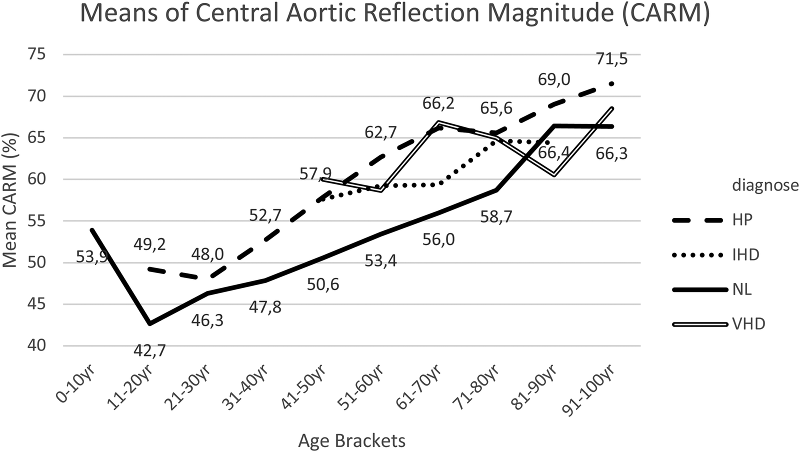 Group IV: Patients with hemodynamically important poly-valvular heart disease, without significant coronary atherosclerotic lesions and without specific antihypertensive medication (VHD). The demographic values per age bracket and diagnosis are presented in Supplementary Table 24.
