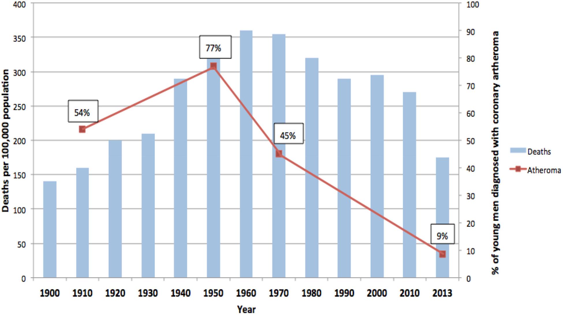 The high prevalence of atherosclerosis in young men was first observed in the coronary arteries of 29 of 65 (45%) of young (mean age 27.7 years) German soldiers who had been killed in World War I (3). In an autopsy study the prevalence of coronary atherosclerosis in young (mean age 22 years) United States soldiers killed in 1950 during the Korean war was 231 of 300 (77%) (4). In 1971 the prevalence of coronary atherosclerosis had fallen to 47 of 105 (45%) among young (mean age 22 years) US soldiers in the Vietnam war (5). In 2013 the prevalence had fallen to 345 of 3832 (8.5%) among US soldiers (mean age 26 years) killed in the Iraq and Afghanistan wars (6). More recent information is available from the Iraq and Afghanistan wars where the prevalence of coronary atherosclerosis was 12%–19% based on autopsies of US soldiers of mean age 29 years (7). These declining trends mirror the fall in reported deaths in the United States due coronary heart disease (Figure 1).
