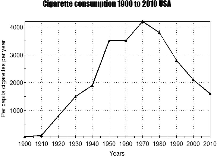 As shown in Figure 2 tobacco smoking in the US grew rapidly from 1900 until a peak prevalence in 1964 (16). During the first world war (1914–1918) the smoking of cigarettes among both the military and general populations dramatically increased. US General John J. Pershing encouraged smoking among soldiers when he stated “You ask me what we need to win the war? I answer, tobacco as much as bullets” (17). For US military veterans smoking had lethal consequences. Rogot & Murray (1980) in a 16 year follow up of these veterans, demonstrated that smokers were at 1.7 times greater than expected risk of death (18). The leading causes of smoking related deaths were emphysema (14.8 times greater than expected), lung cancer (11 times), aortic aneurism (5 times) and coronary heart disease (1.6 times) (18).
