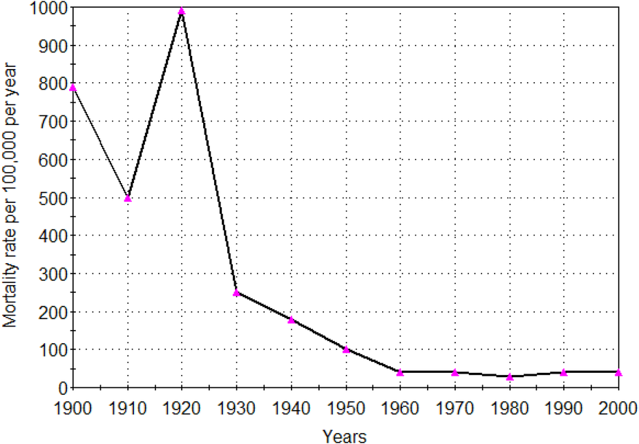 While infections may have a role in the initiation of atherosclerosis in child hood and during later life they do not appear to have influenced the rise and fall of coronary atherosclerosis (47). There was a continuous decline in deaths at all ages due to infectious diseases during the 50 years 1900–1950 the same period as the continuous rise in atherosclerosis and coronary heart disease (48). Deaths due to infectious disease continued to decline during the next 50 years 1950–2000. Coronary atherosclerosis and coronary heart disease also declined during this latter period. Adult mortality rates due to infectious diseases from 1900 to 2000 are shown in Figure 3.