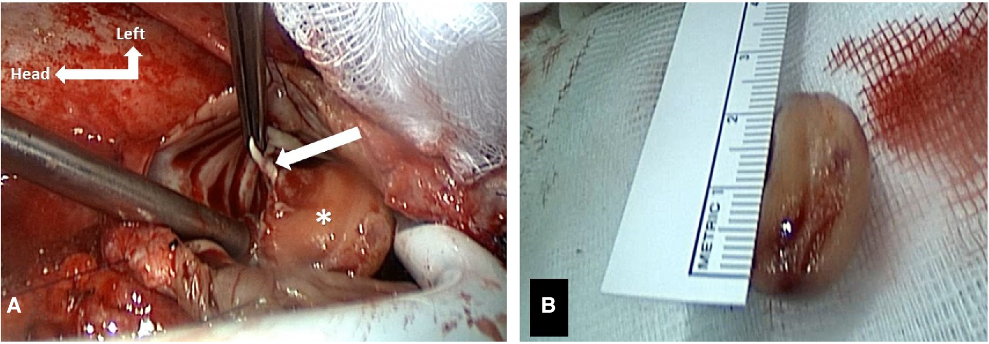 (A) Intraoperative findings of the right atrial mass attached to the Eustachian valve (arrow). (B) Intraoperative resected mass measuring approximately 2.5 cm × 2.1 cm.