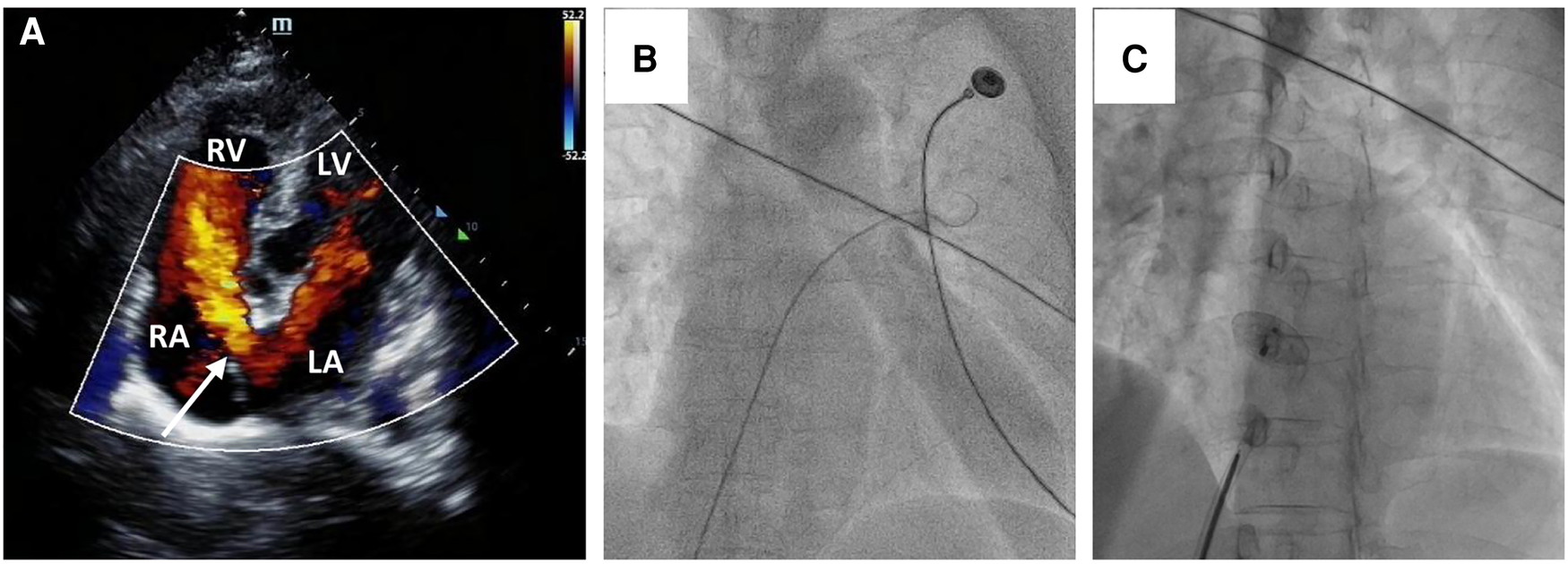 Secundum-type ASD finding and percutaneous secundum-type ASD closure. Transthoracic echocardiography revealed about 22 mm ASD (white arrow) with shunt flow from left atrium to right atrium (A) The intraoperative fluoroscopy showed that the guidewire passed through the inferior vena cava and the right atrium sequentially, and then through the defect site to the left atrium (B); a 24 mm ASO device was successfully deployed in the ASD (C).